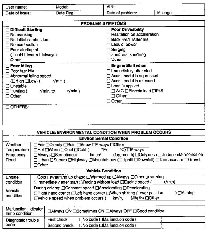 STEP 1: Customer Complaint AnalysisRecord details of the problem (failure, complaint) and how it occurred as described by the customer. For this purpose, use of such an inspection form will facilitate collecting information to the point required for proper analysis and diagnosis.