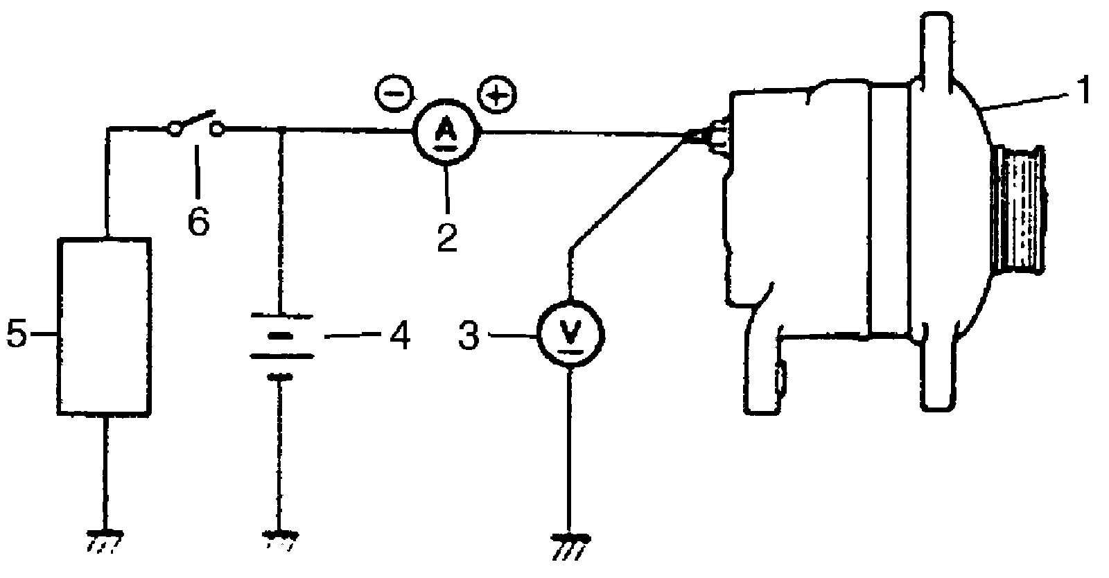 5. Connect switch (6), load (5), battery (4), voltmeter (3) and ammeter (2) to generator (1) as shown in figure.