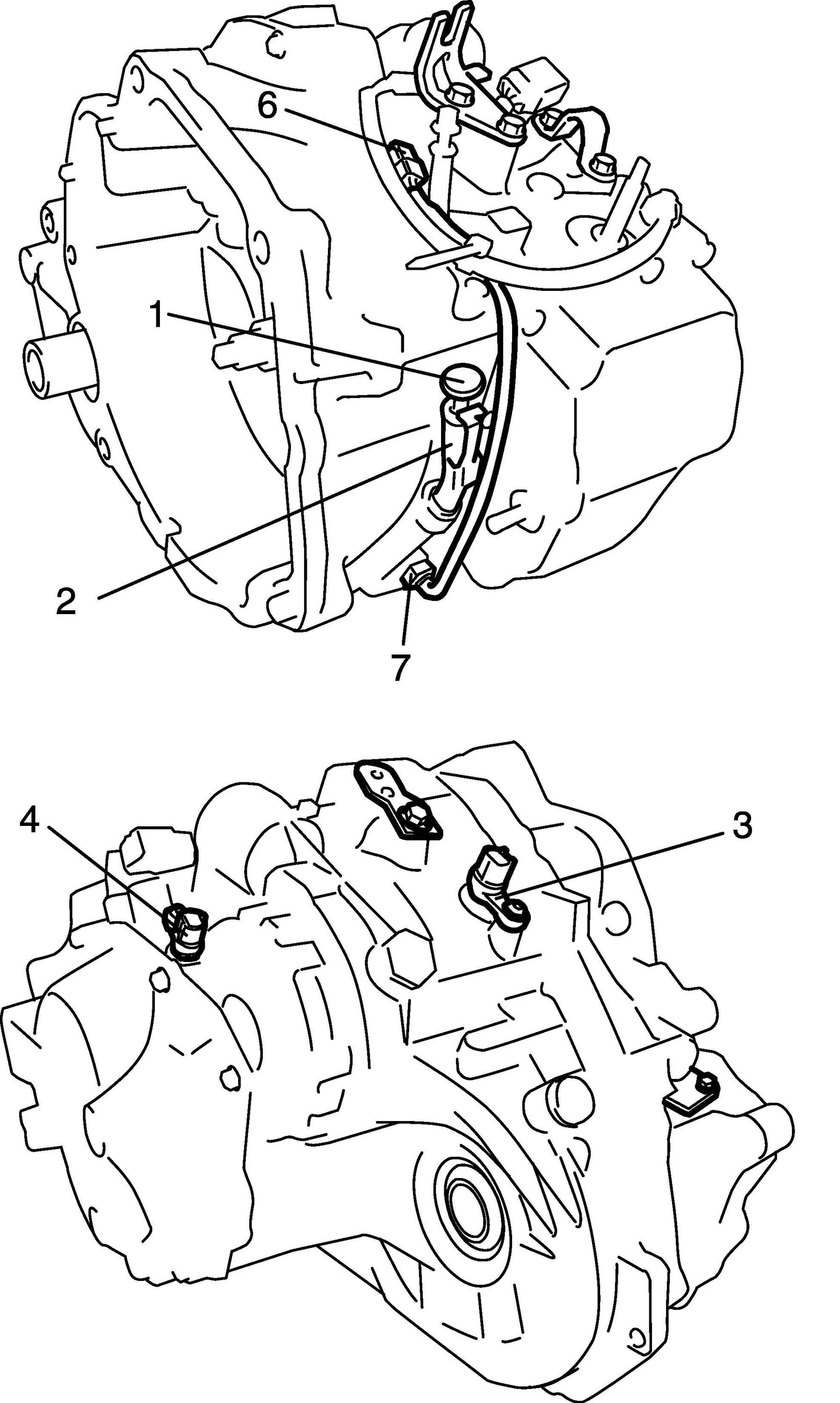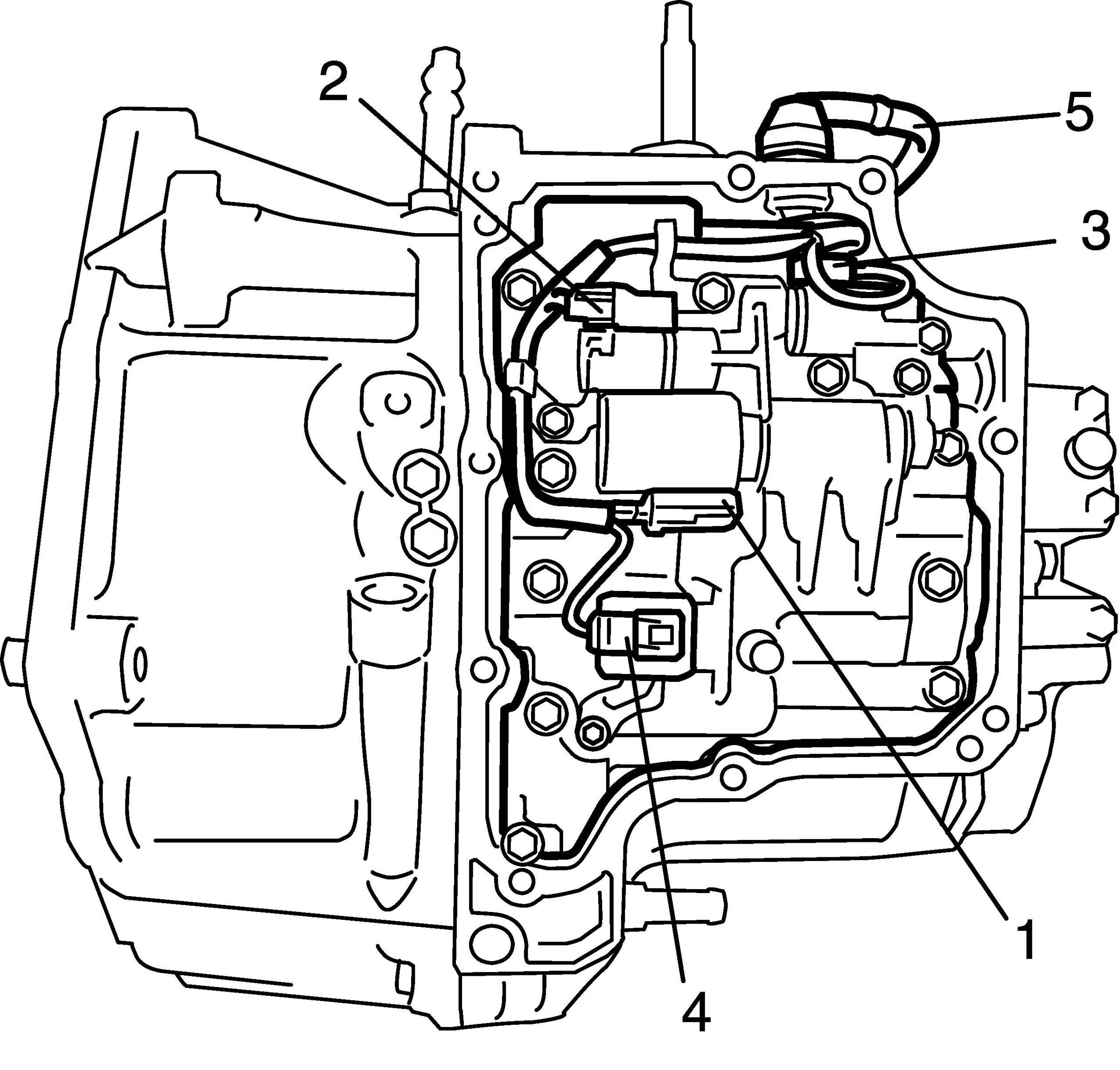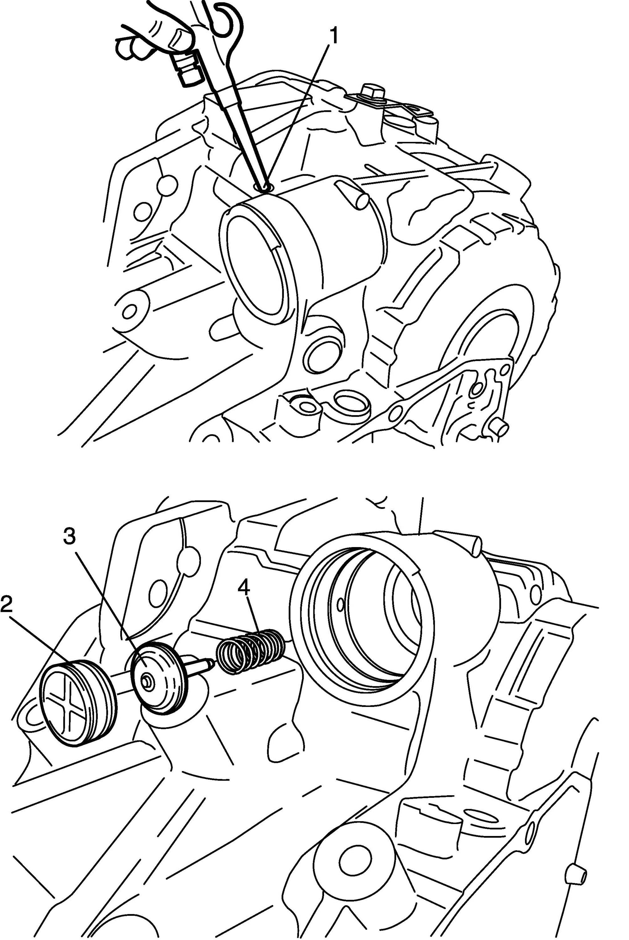 2. Remove fluid level gauge (1), fluid filler tube (2), output shaft speed sensor (3) and input shaft speed sensor (4) (for speedometer).