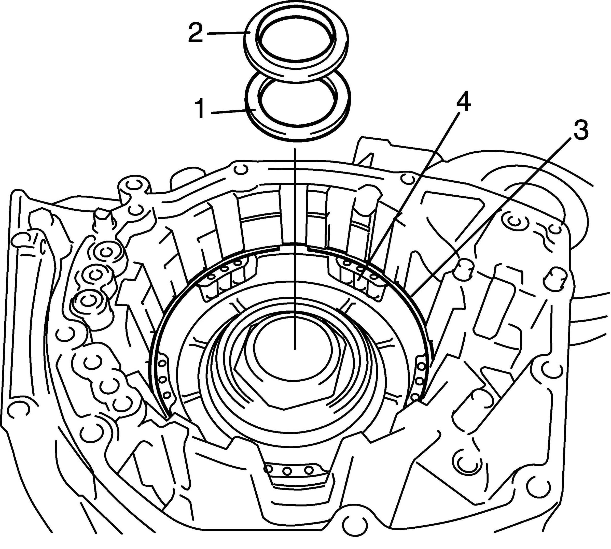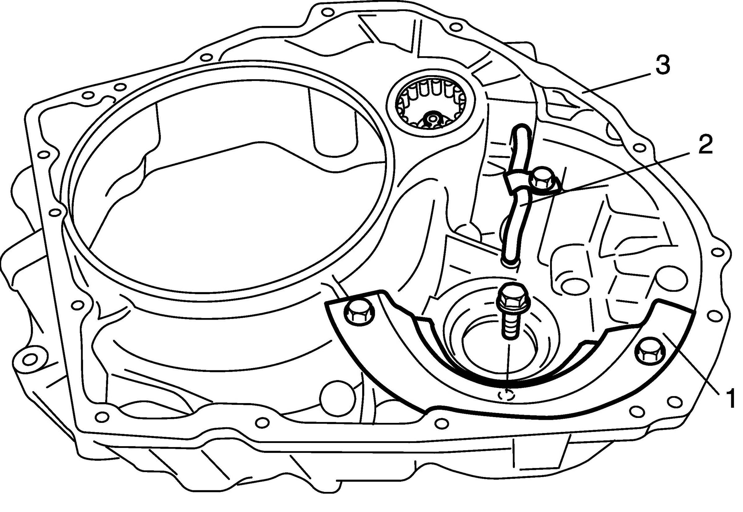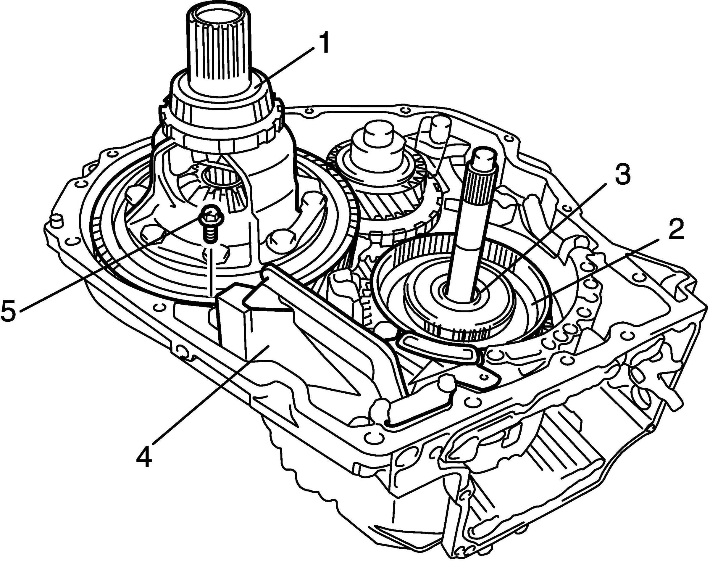 2. Remove fluid level gauge (1), fluid filler tube (2), output shaft speed sensor (3) and input shaft speed sensor (4) (for speedometer).