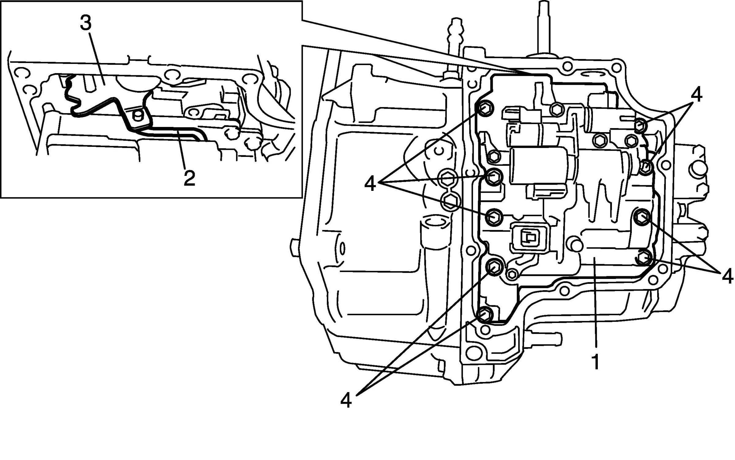 9. Remove valve body assembly (1) by removing 9 bolts (4), and then disconnect manual valve connecting rod (2) from manual valve lever (3).