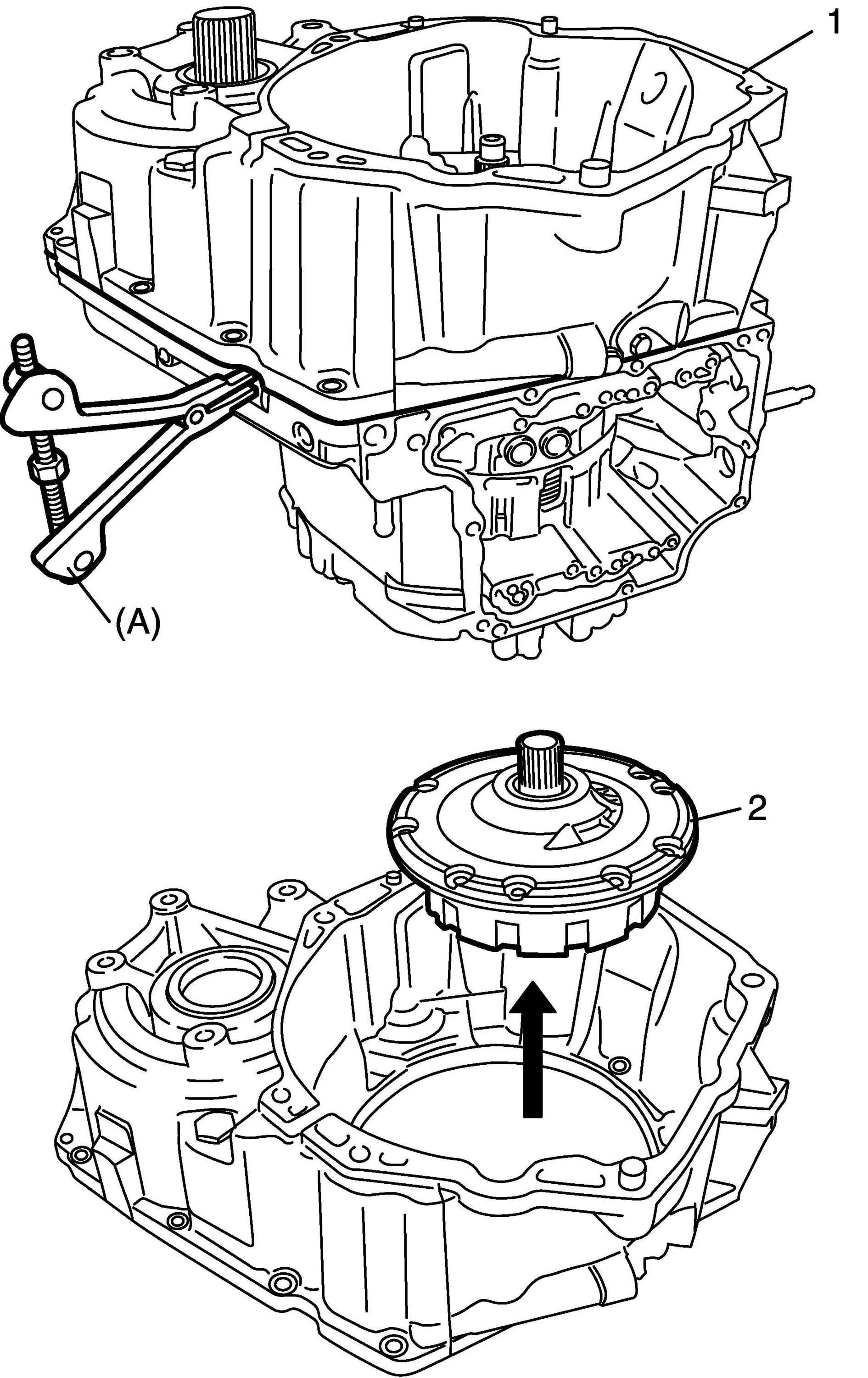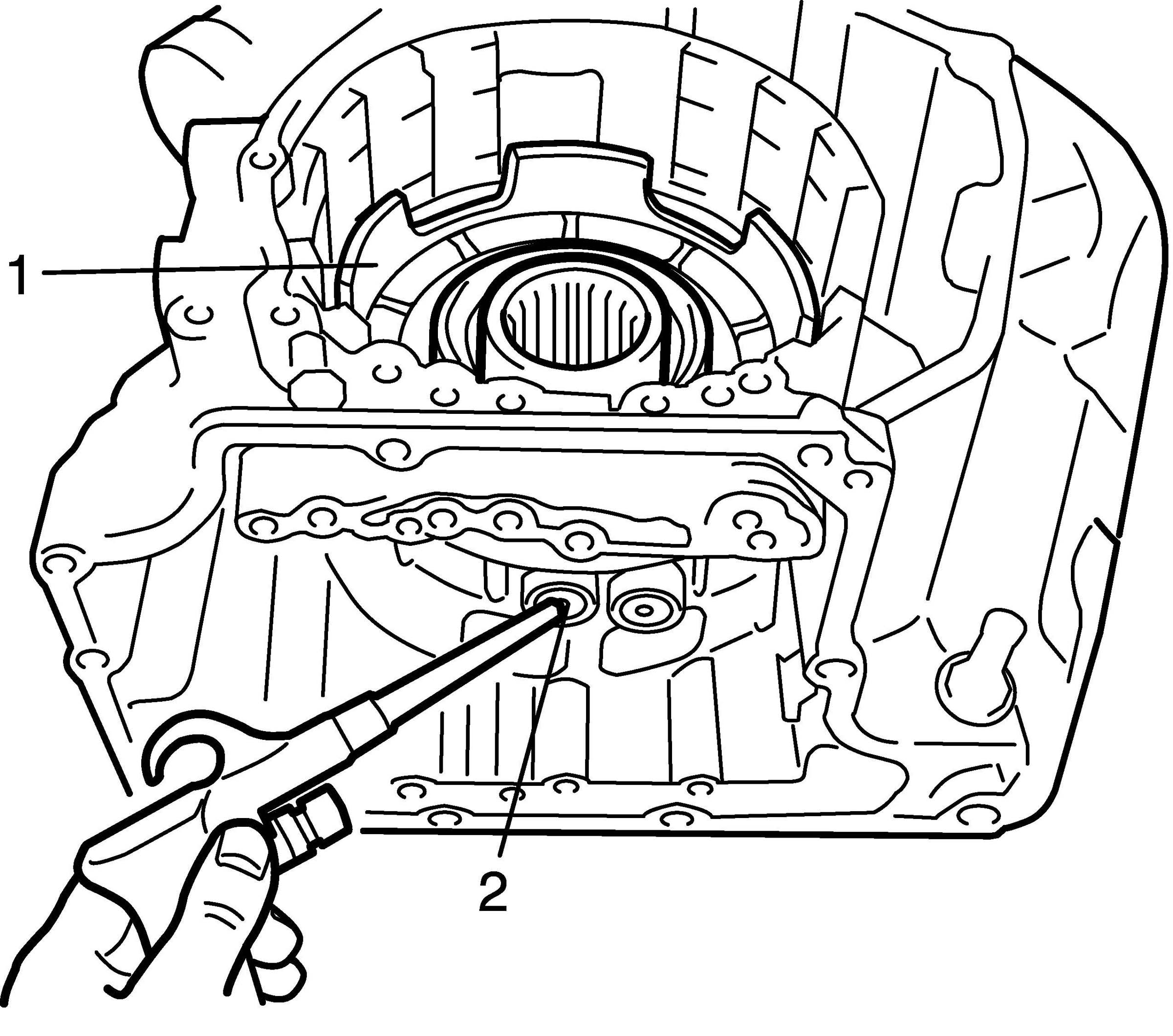 13. Remove transaxle housing with oil pump (1), using special tool, and then remove oil pump body (2) by hand.