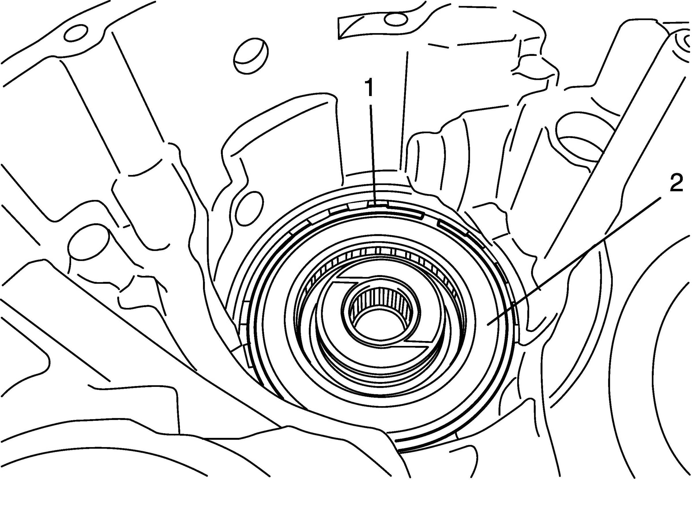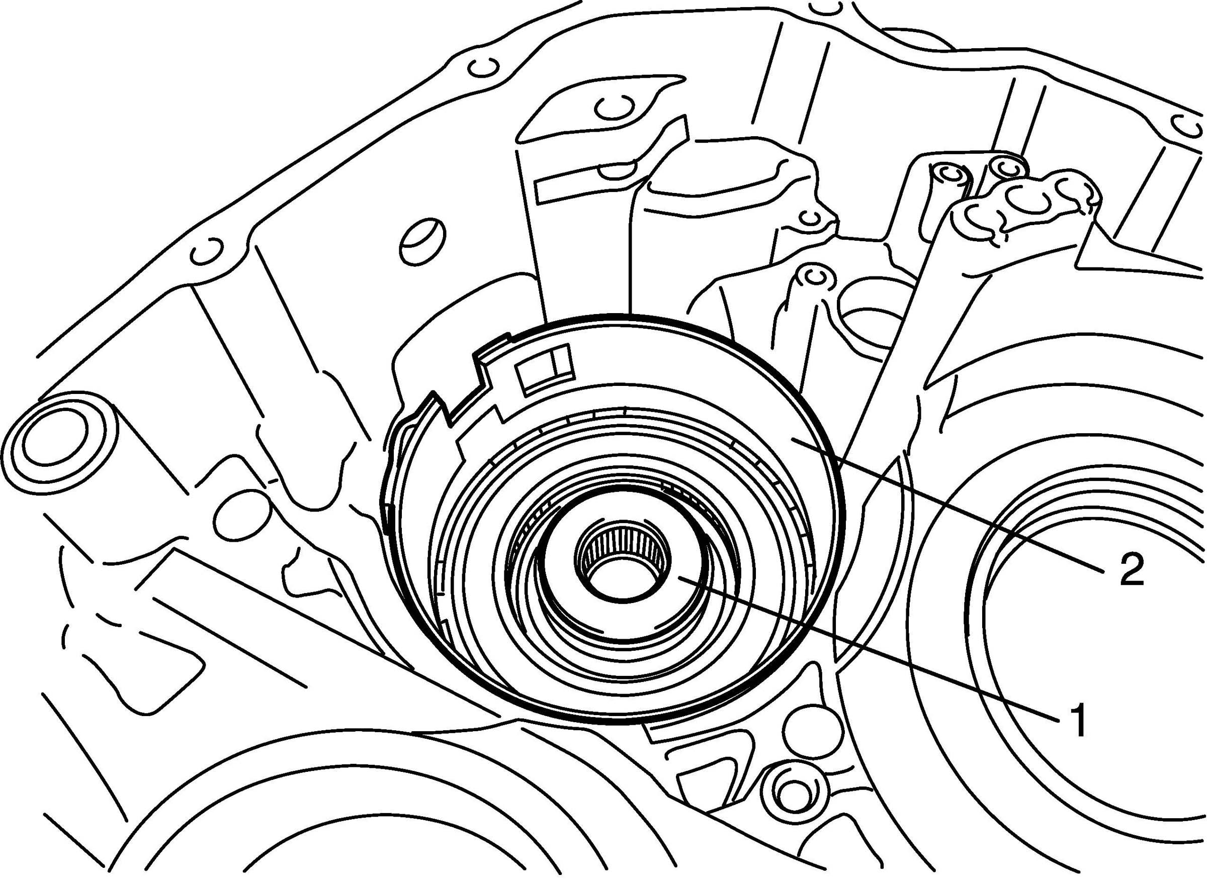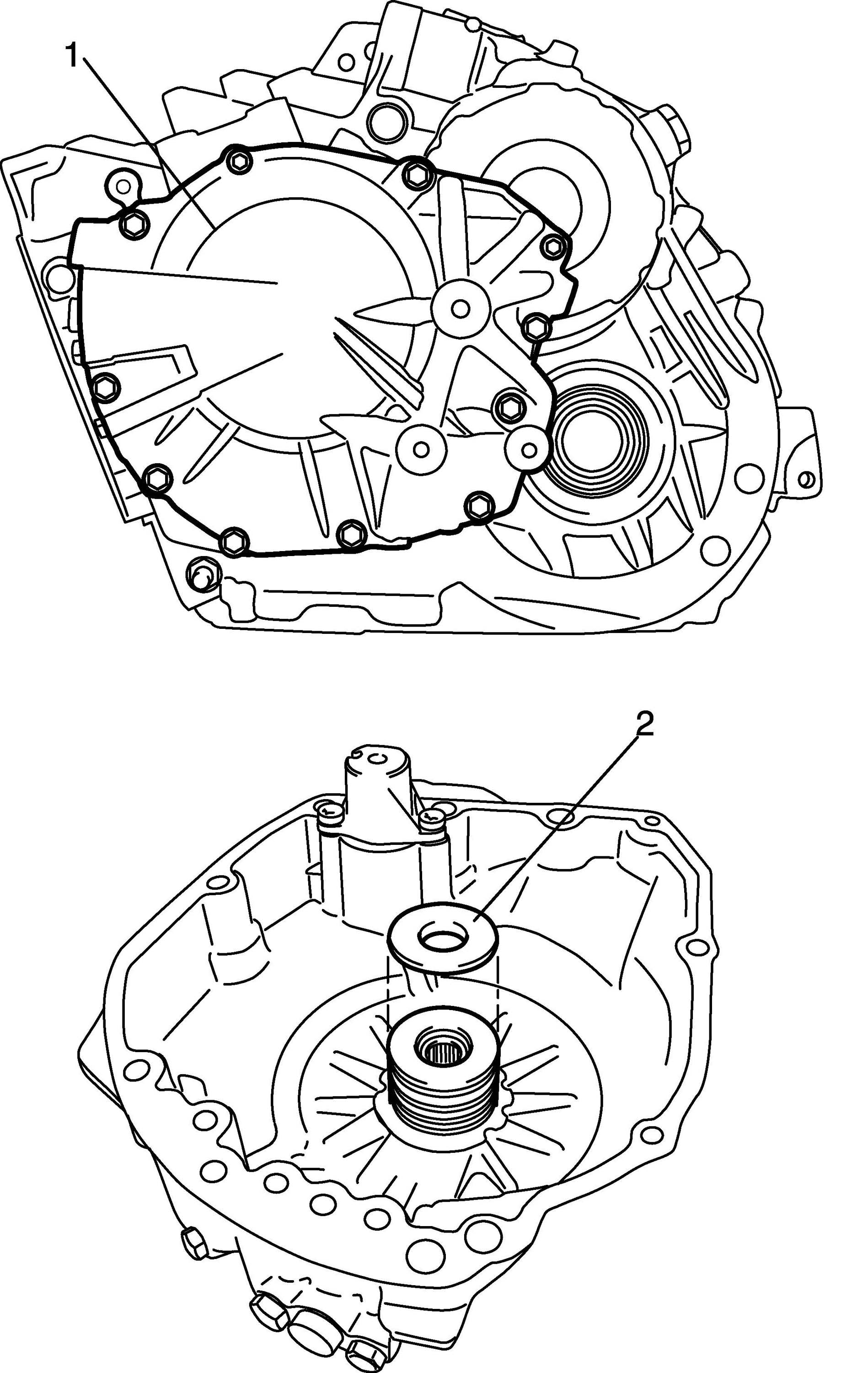 23. Pull out transaxle rear cover (1) and input shaft rear thrust bearing rear race (2).