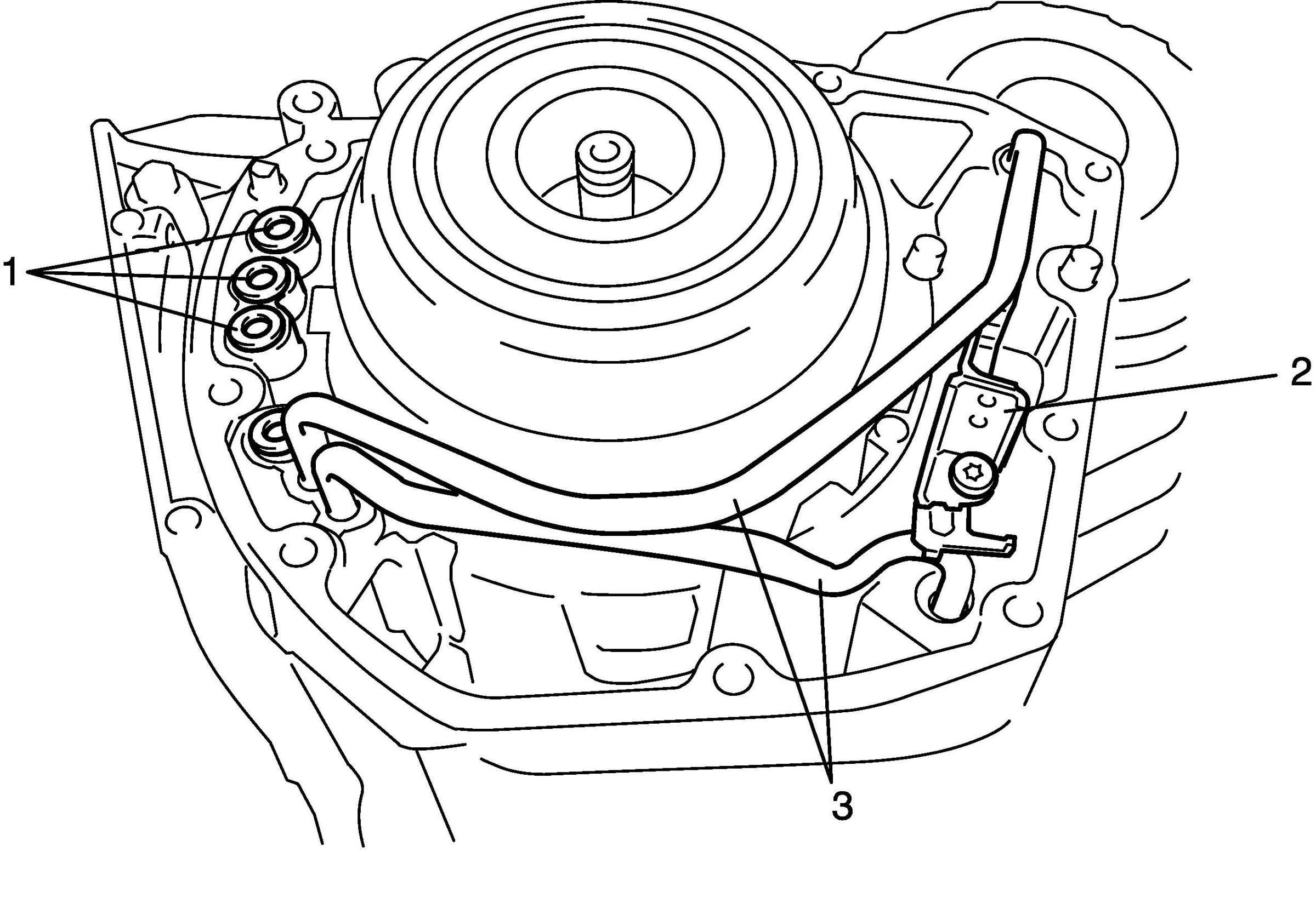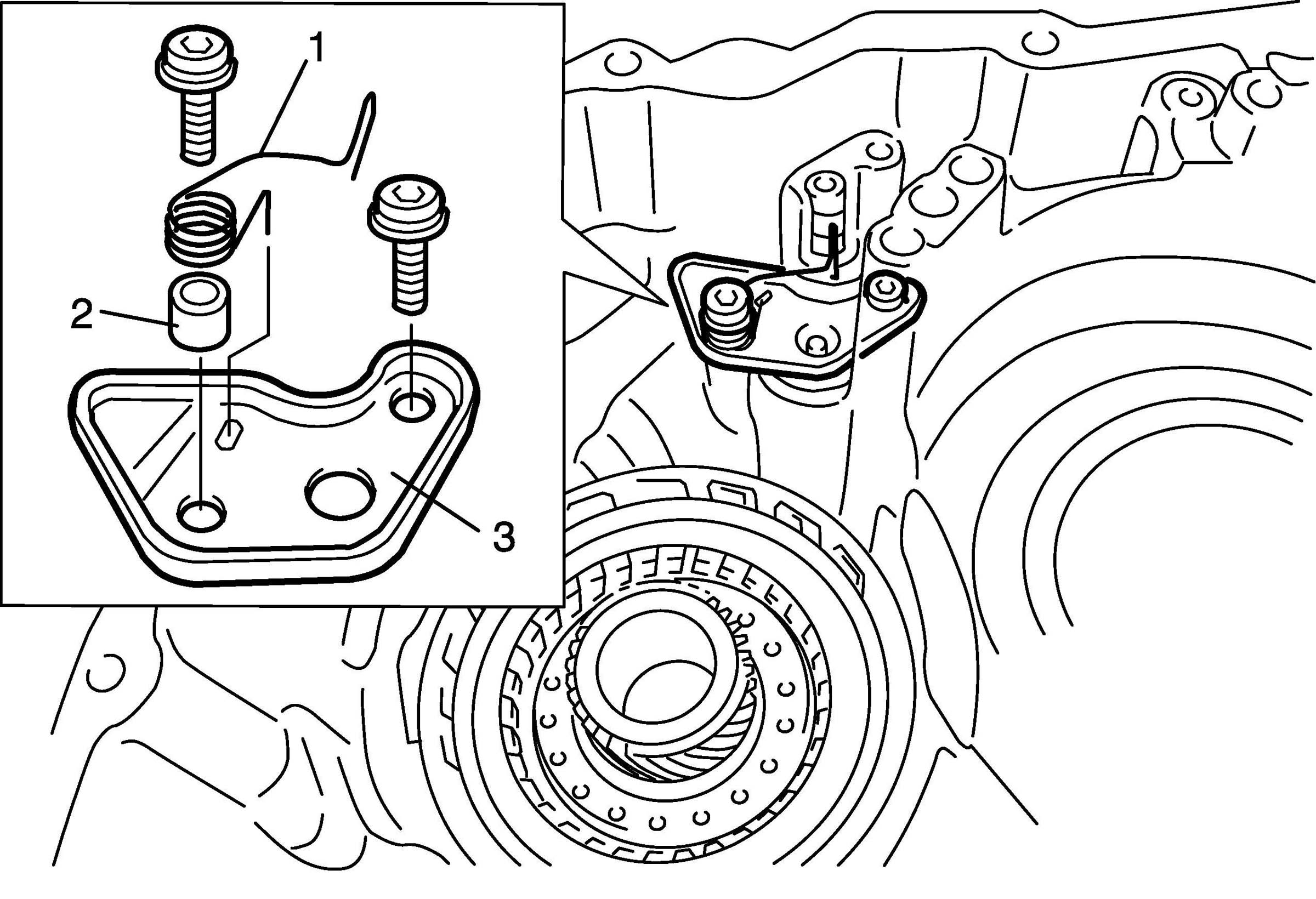 40. Remove torsion spring (1), spacer (2) and underdrive brake accumulator bracket (3).