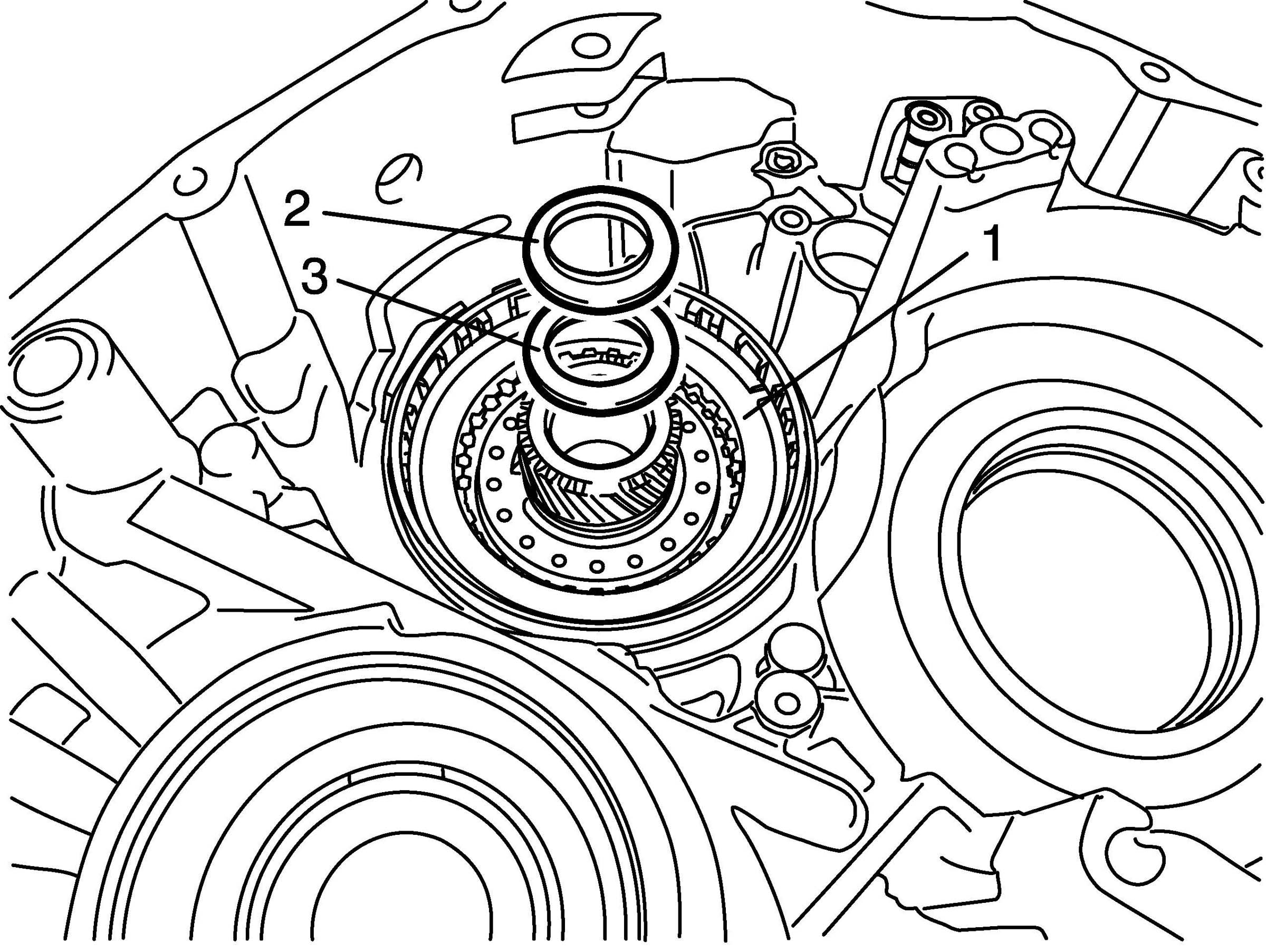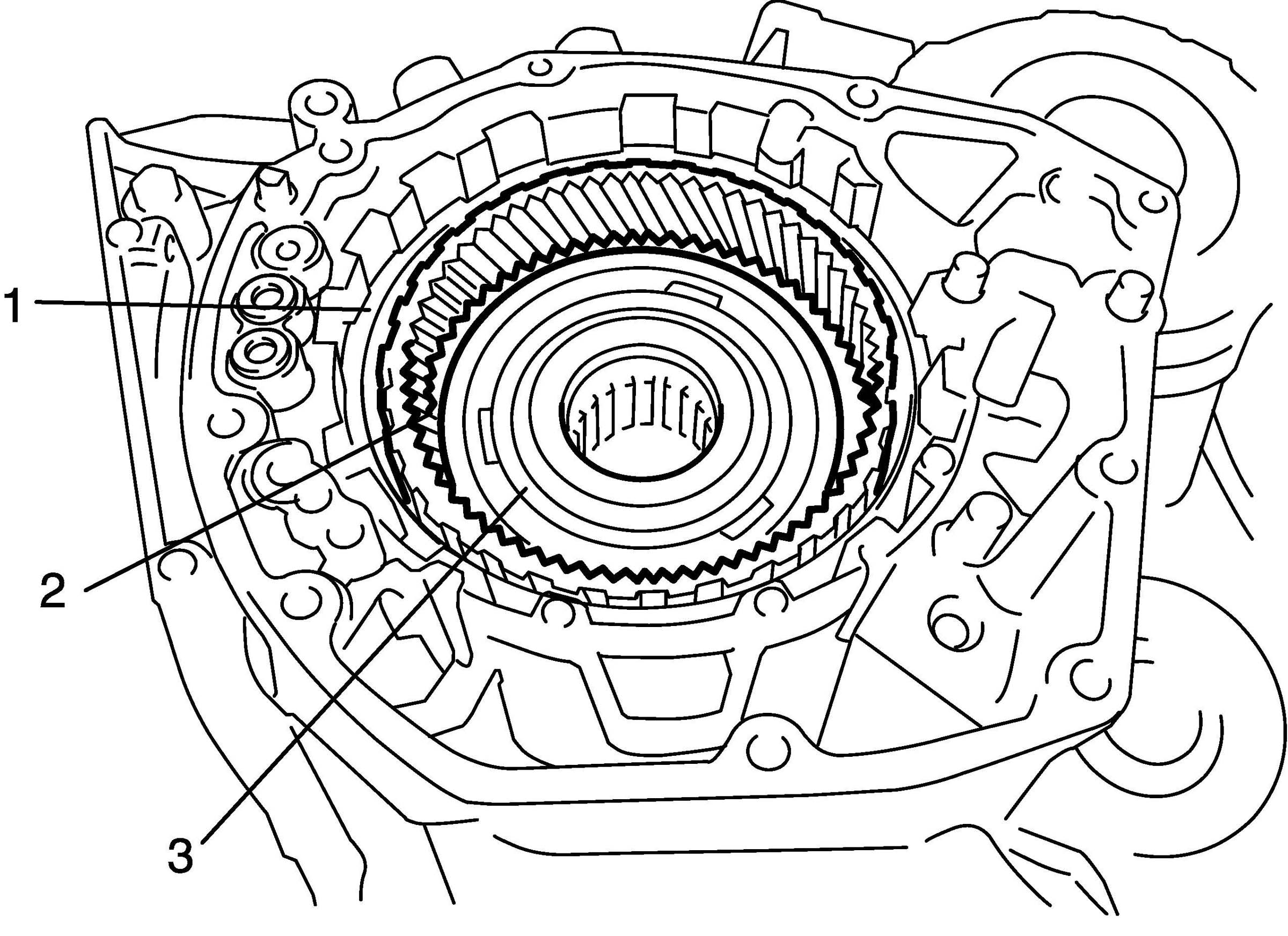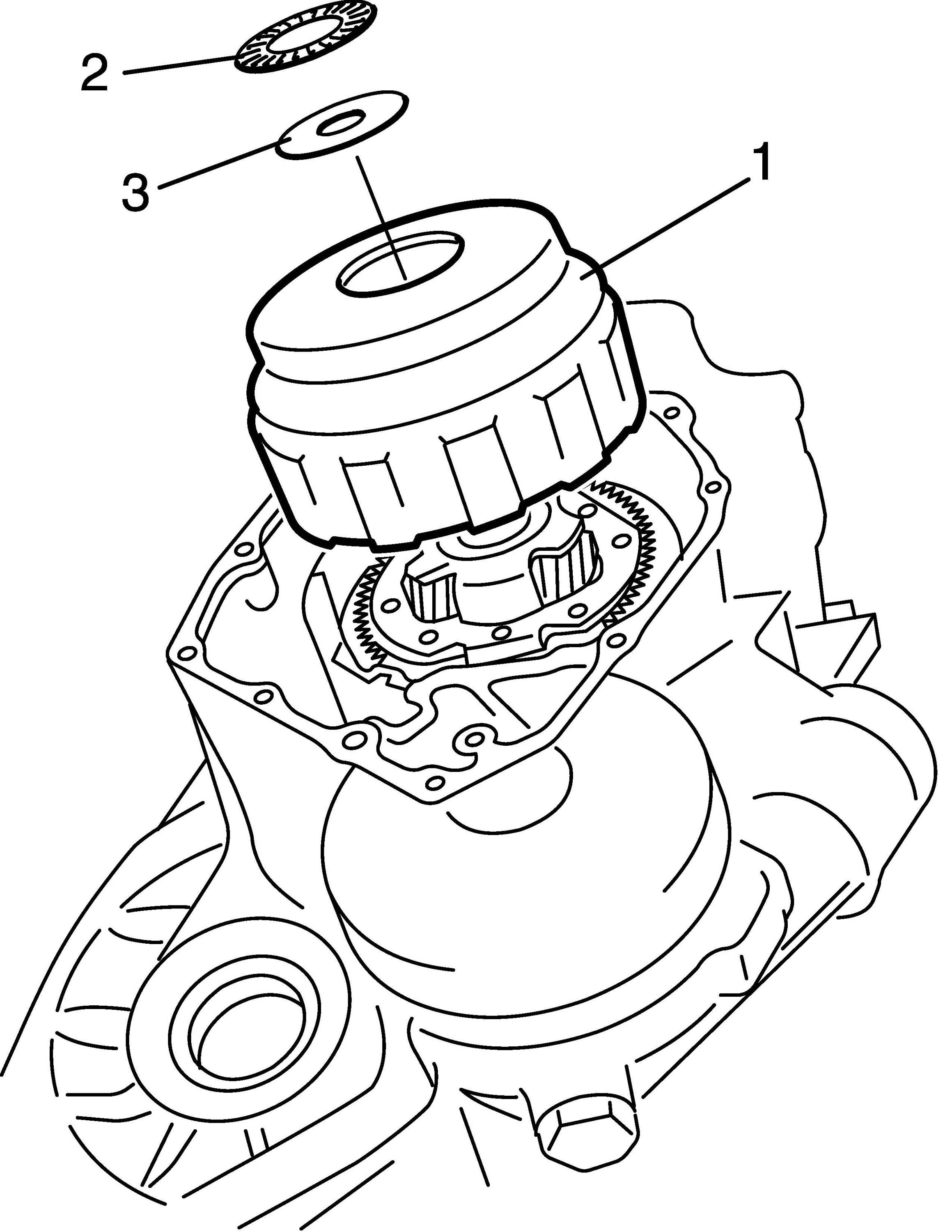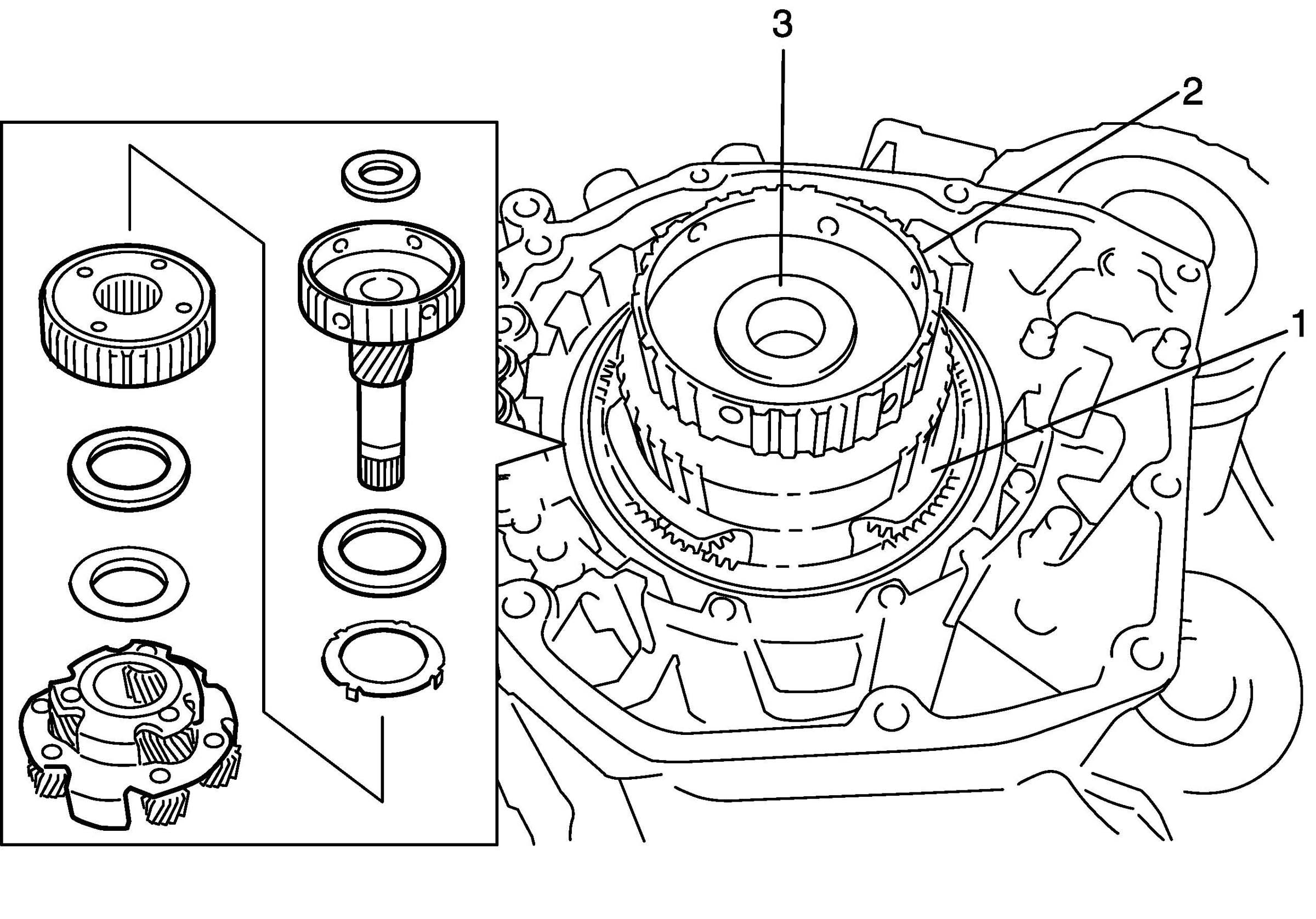 43. Remove underdrive clutch assembly (1) with bearing (2) and race (3).