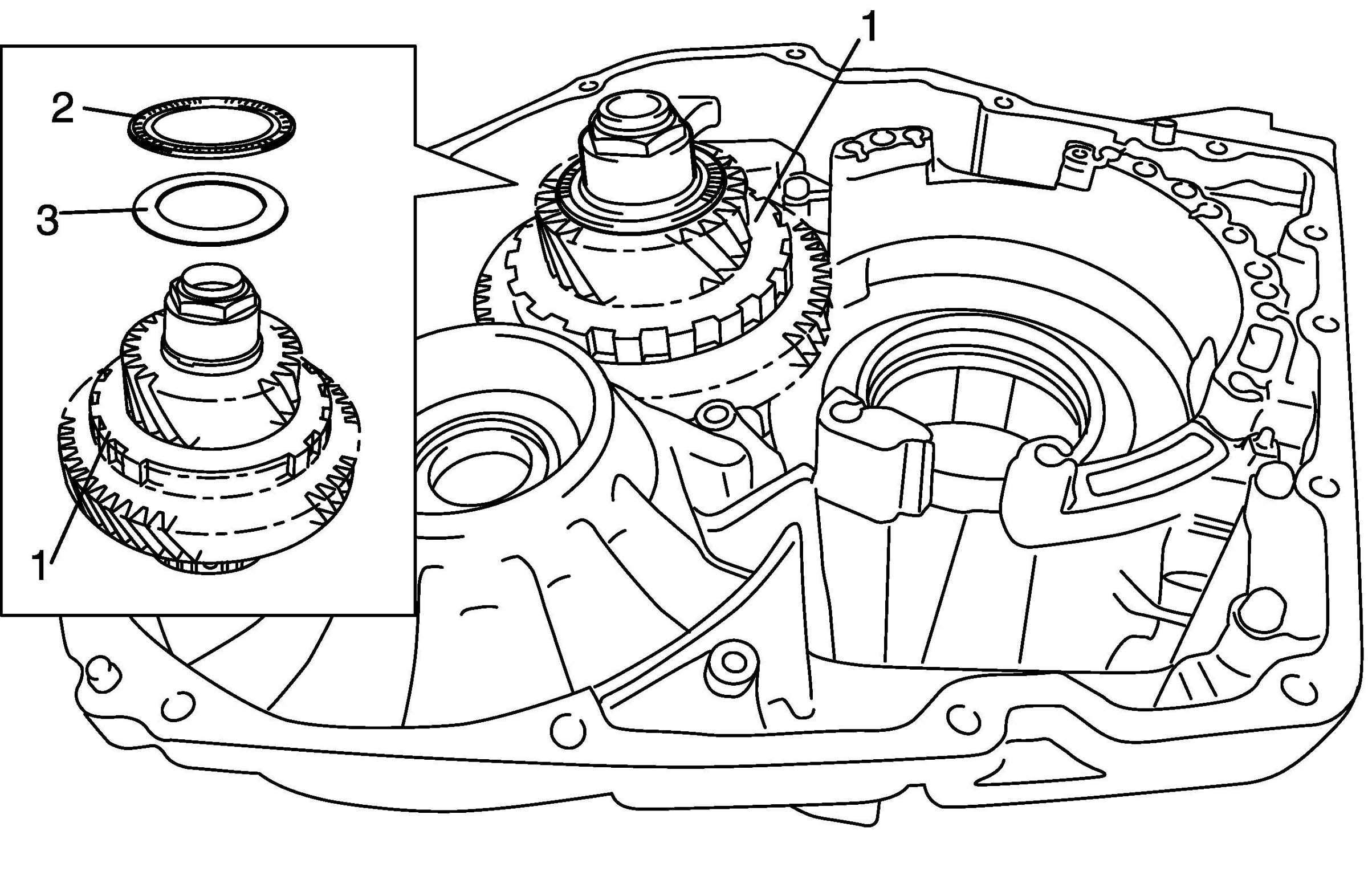 19. Remove one-way No. 1 clutch assembly (2) and one-way No. 1 clutch front thrust washer (3).