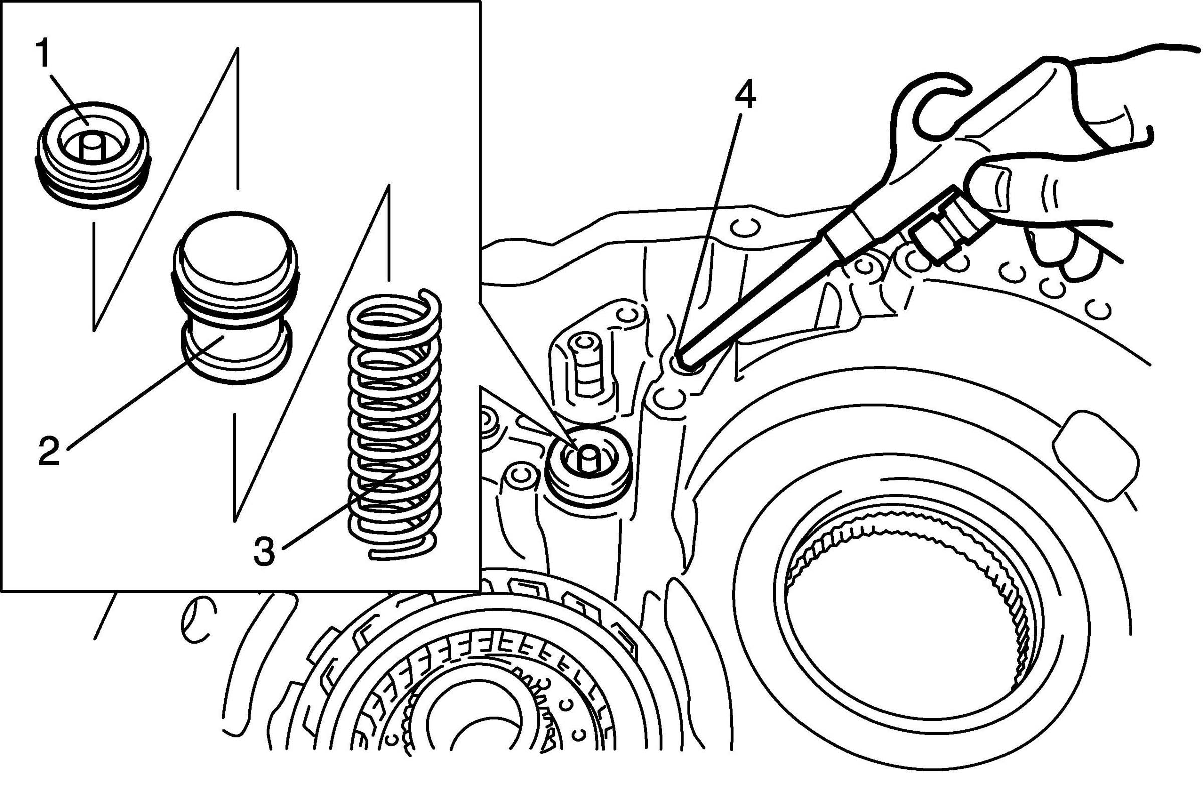 41. Remove underdrive brake accumulator cover (1), piston (2) and spring (3) while applying and releasing compressed air (400 - 800 kPa, 4 - 8 kg/cm2, 57 - 113 psi) through oil hole (4).