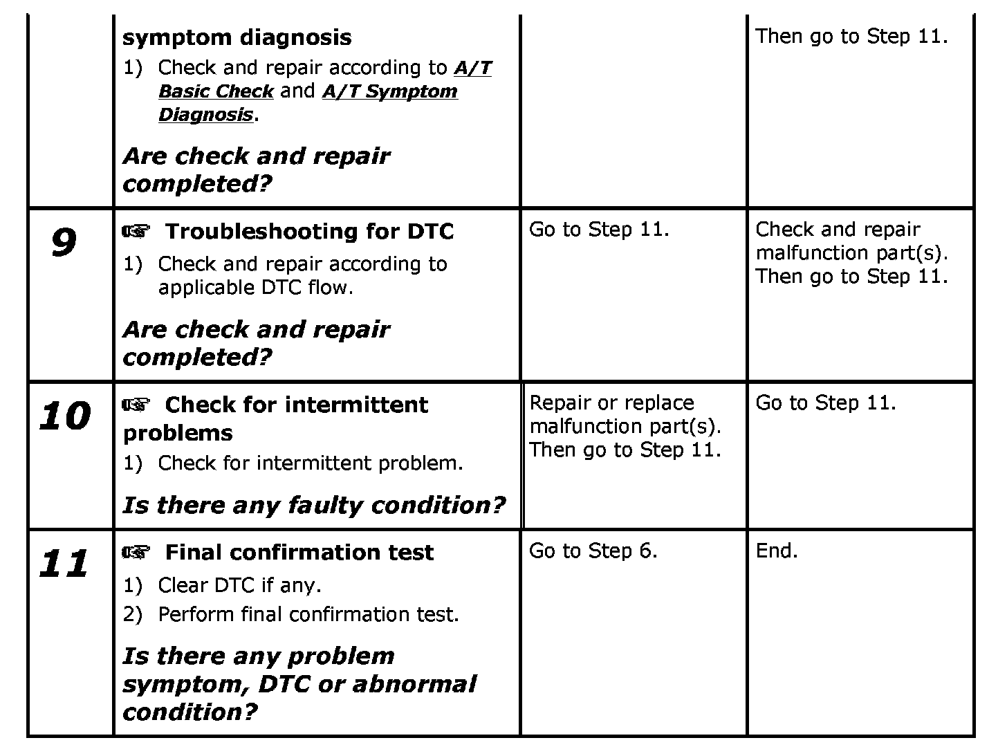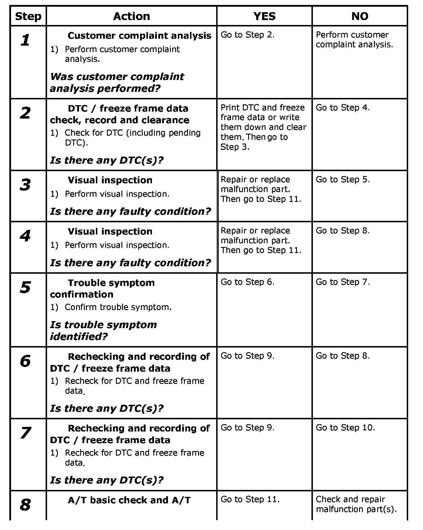 Perform basic check of A/T according to A/T Basic Check first. When the end of the flow has been reached, check the parts of the system suspected as a possible cause referring to A/T Symptom Diagnose and based on symptoms appearing on the vehicle (symptoms obtained through steps of customer complaint analysis, trouble symptom confirmation and/or A/T basic check) and repair or replace faulty parts, if any.
