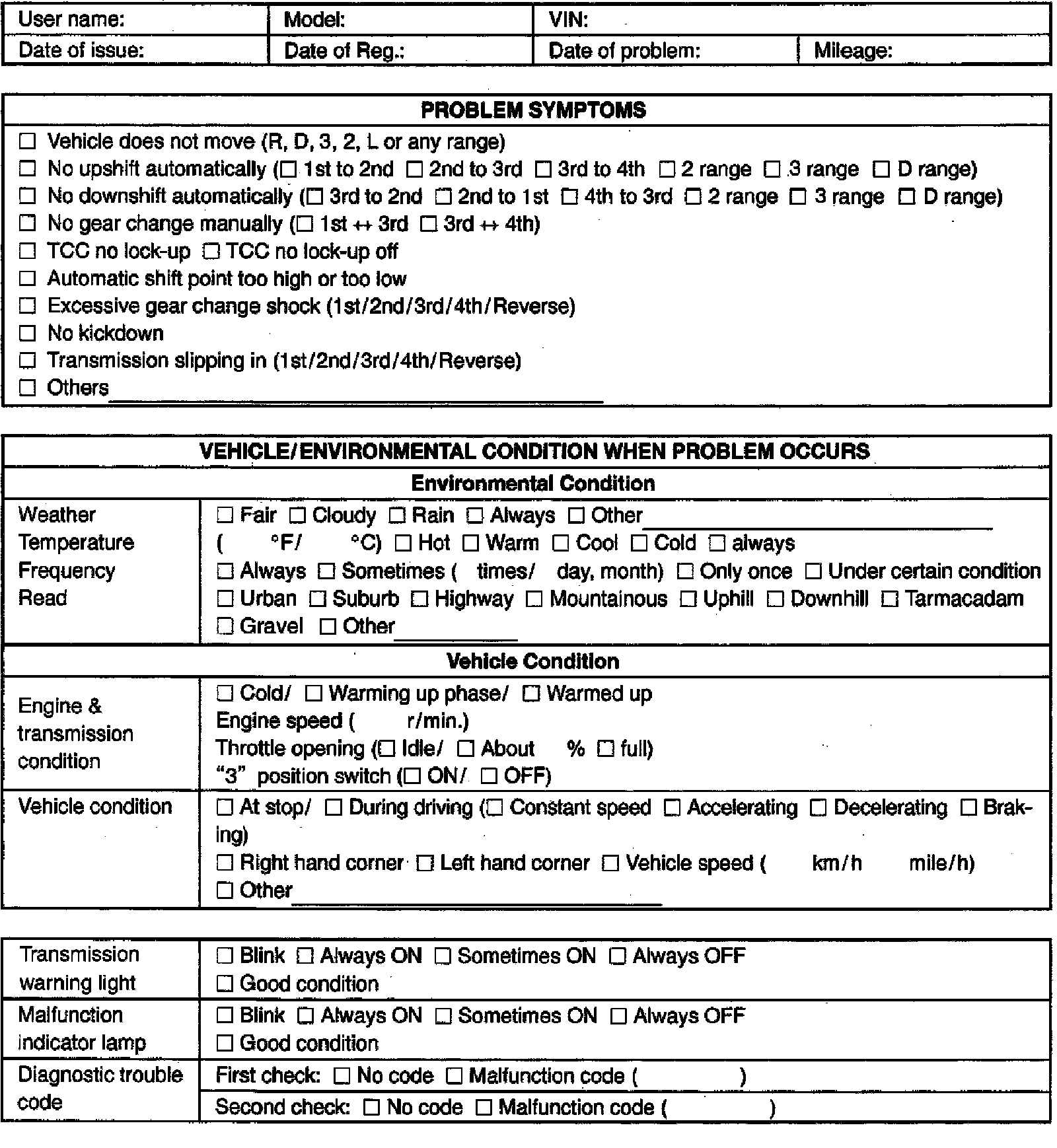 Customer problem inspection form (Example)