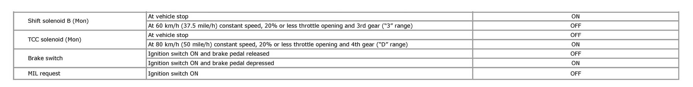 Also, condition in the following table that can be checked by the scan tool are those detected by TCM and output from TCM as commands and there may be cases where the automatic transaxle or actuator is not operating (in the condition) as indicated by the scan tool.