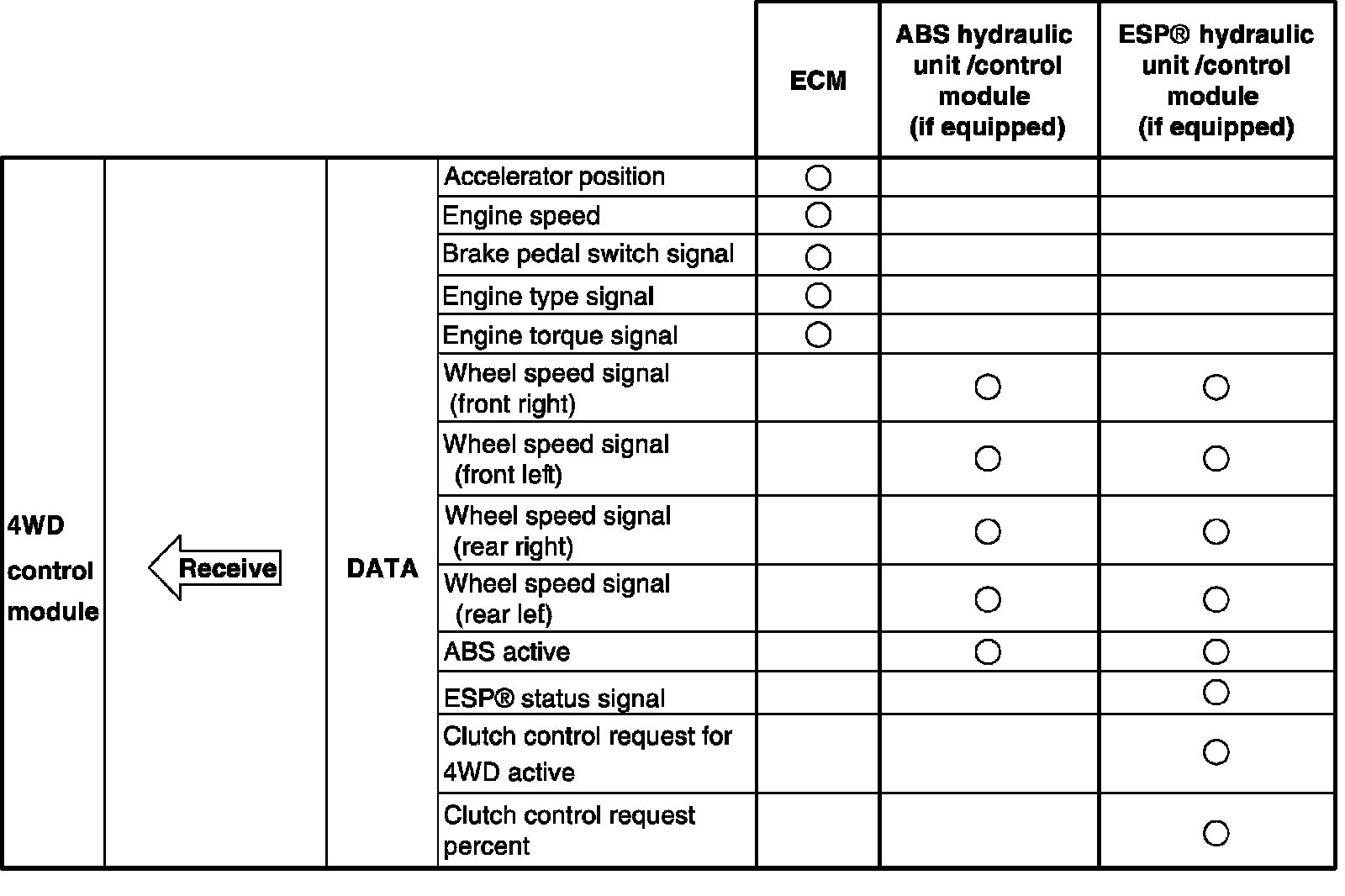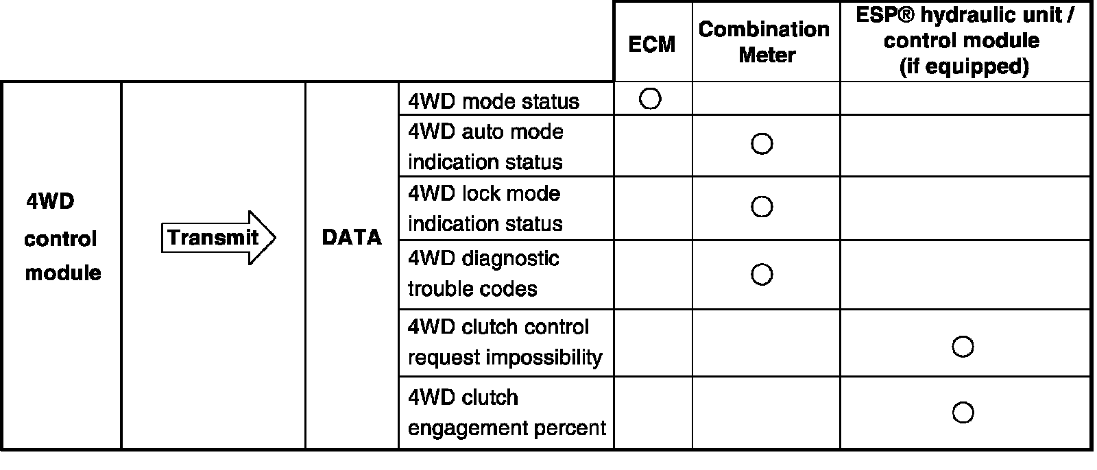 CAN Communication System DescriptionWhen 4WD control module receive the signal of abnormal as following information, vehicle is not changed to 4WD-auto and 4WD-lock mode.