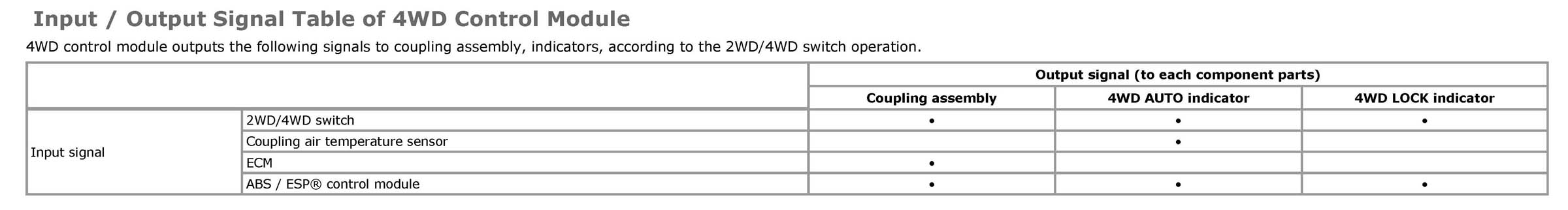 Input / Output Signal Table of 4WD Control Module