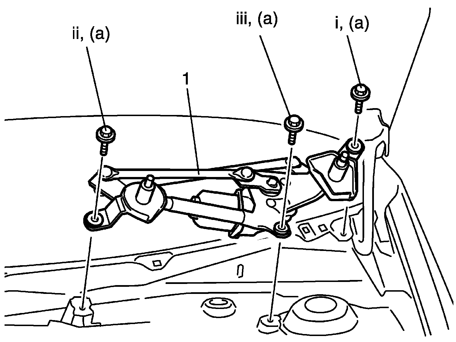1. Install windshield wiper assembly (1), and tighten bolts to specified torque in order of "i", "ii" and "iii" indicated in figure.