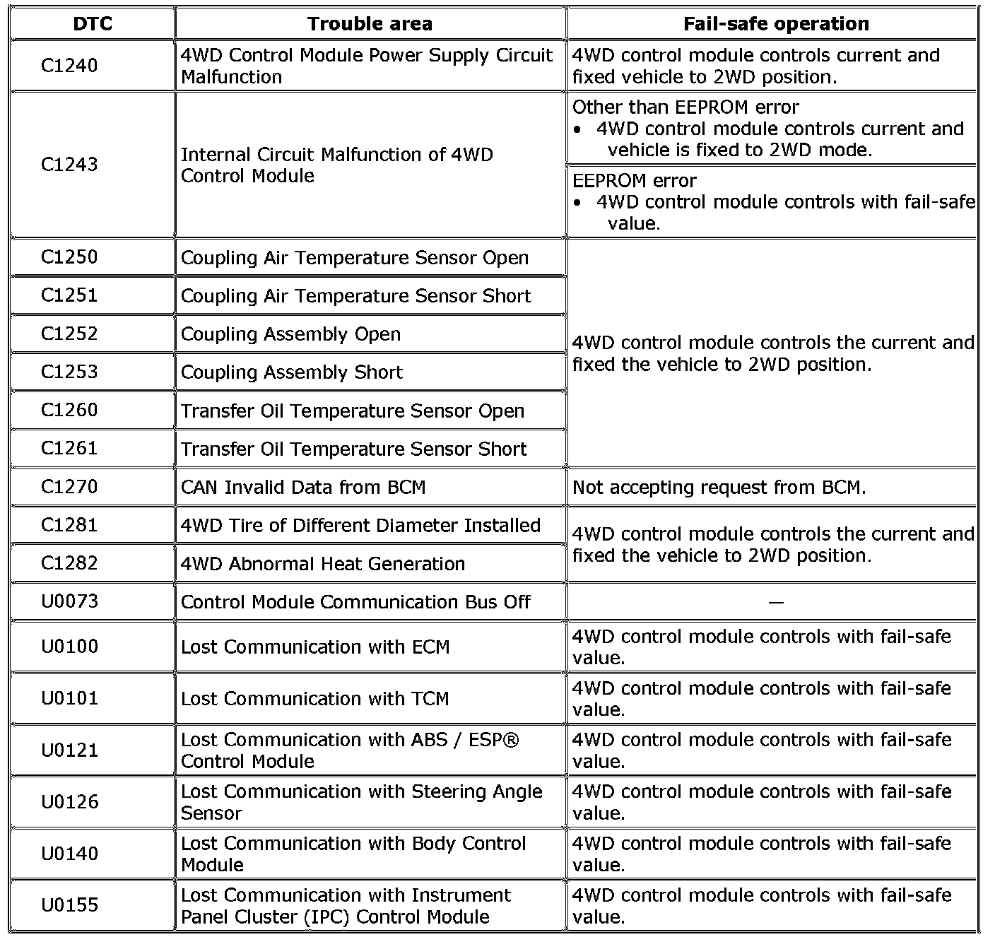 Fail-Safe TableThis function is provided by safe mechanism that assures safe driveability even when coupling assembly, switch, sensor or its circuit fails. The following table shows the fail safe function for each fail condition of sensor, coupling assembly, switch, 4WD control module or its circuit.
