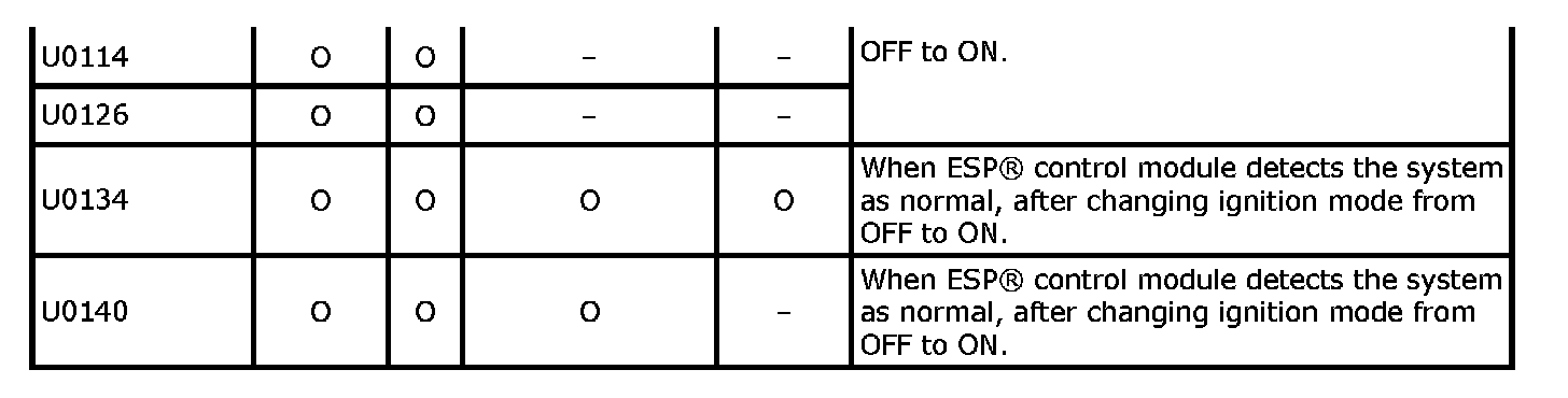 Fail-Safe TableWhen any of the following DTC(s) is detected, ESP(R) system is in fail-safe mode per its DTC and ABS, EBD, traction control, stability control are deactivated until the resolution is applied.