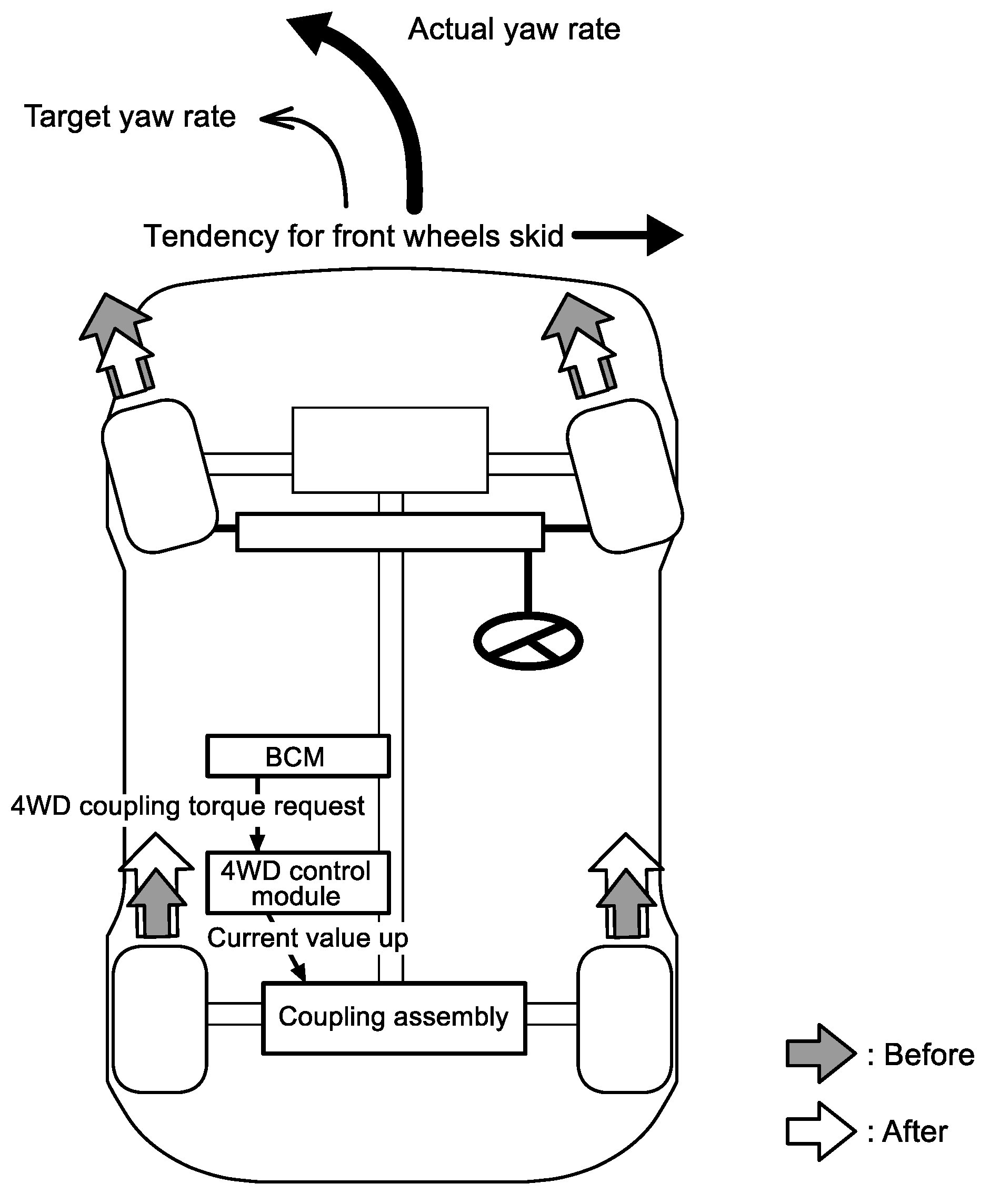 BCM sends 4WD coupling torque request (rear wheel traction torque increase request) to 4WD control module based on understeering level via CAN communication. This increases the rear wheel traction torque and reduces the influence of traction force at the front wheels, and this inhibits understeering.