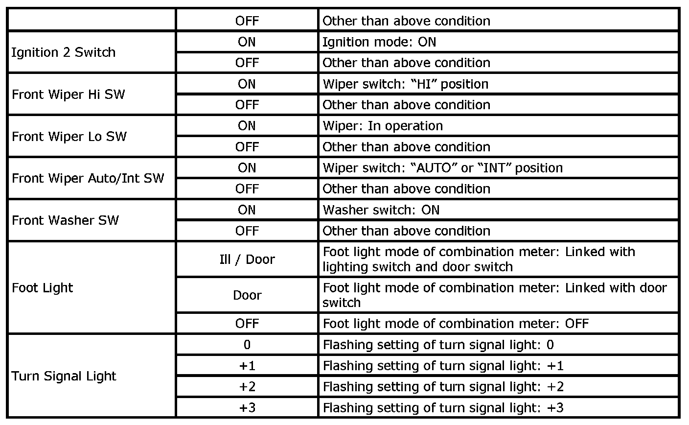 - For "Ignition mode" described in the following table, it means power supply mode in keyless push start system.