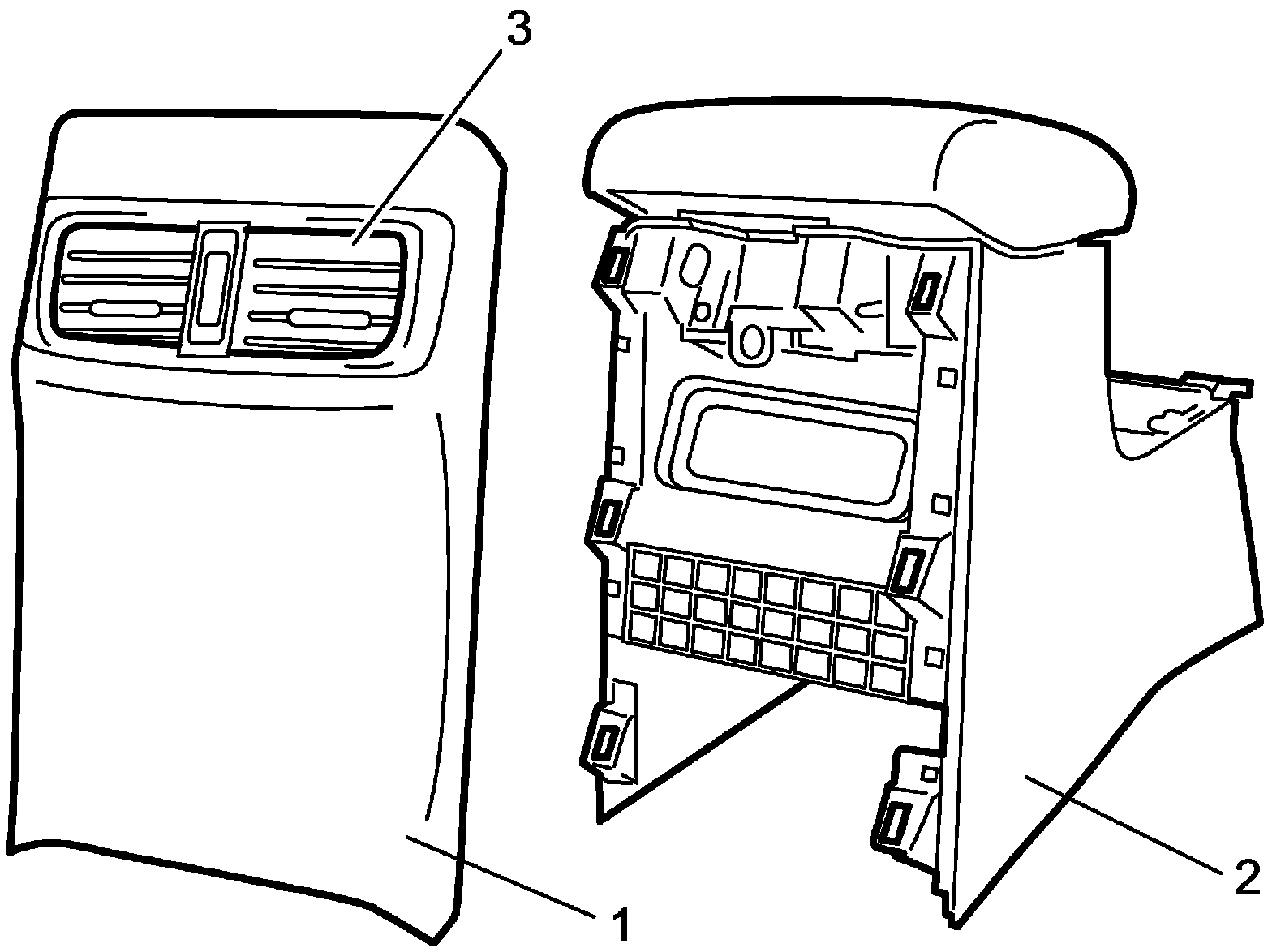 2. Release tabs, and then remove rear ventilation louver (3) with rear end panel (1) from center console box assembly (2).