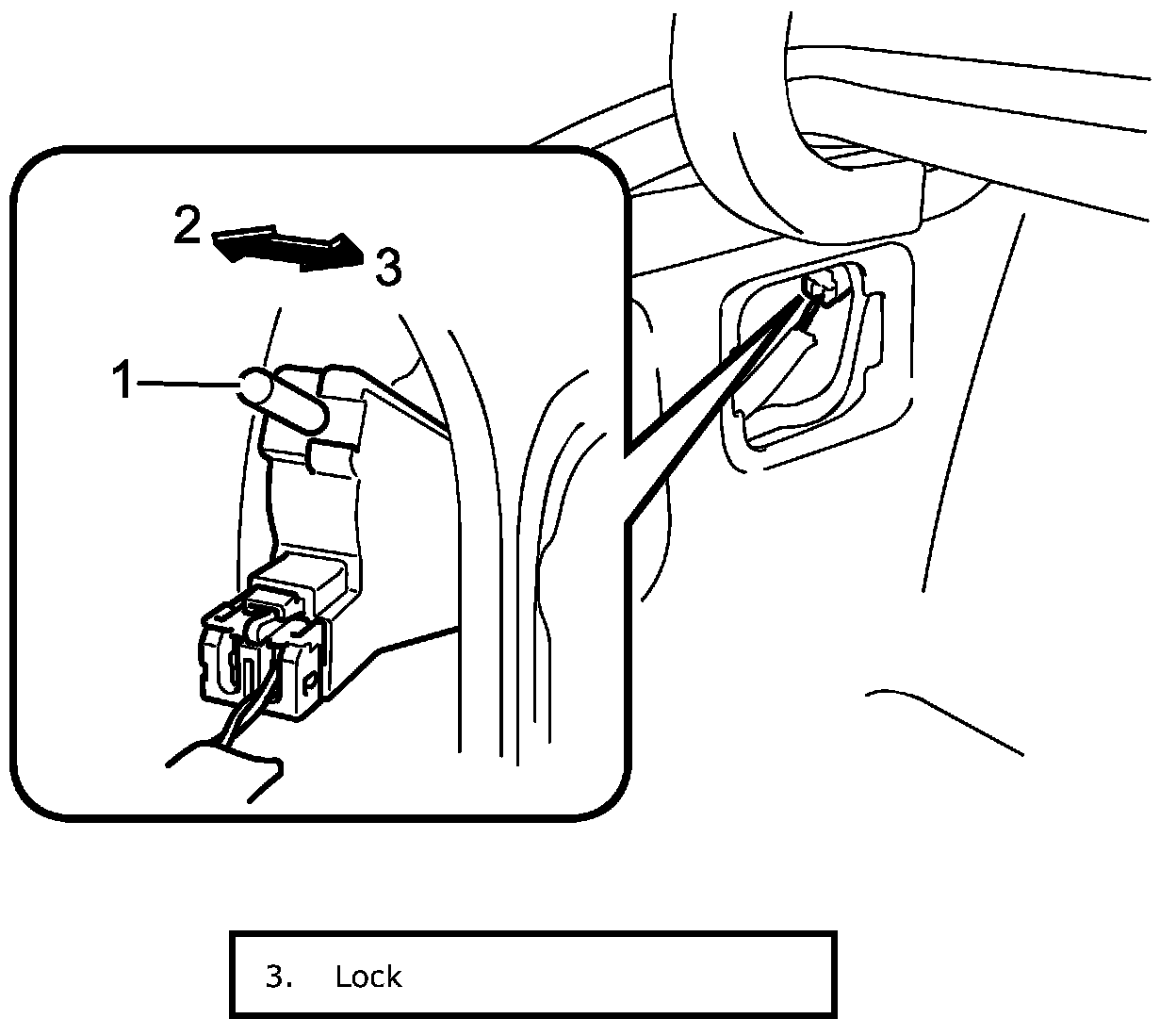 Fuel Lid Opener DescriptionFuel lid opener is located in the fuel lid box and is accessed by removing trunk side lid. The fuel lid can be opened by moving rod (1) in arrow (2) direction when battery is dead or malfunction occurs in the door lock system.