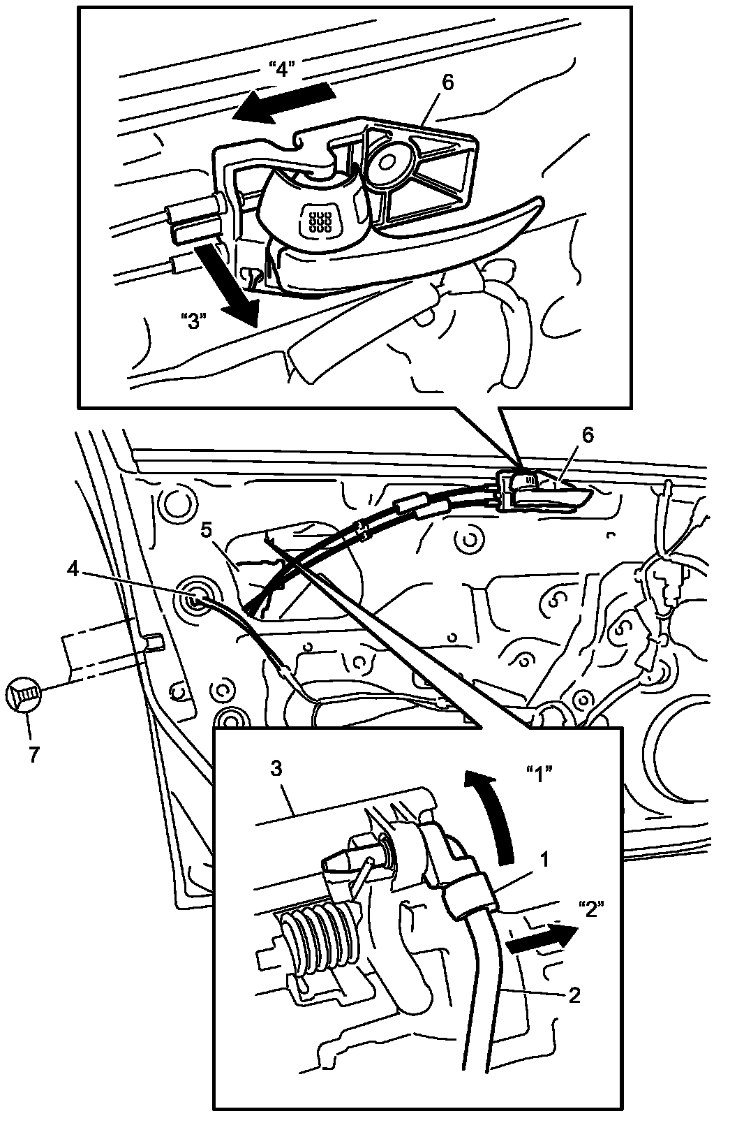 5. Remove inside door handle (6) by moving it in directions of arrow "3" and "4".