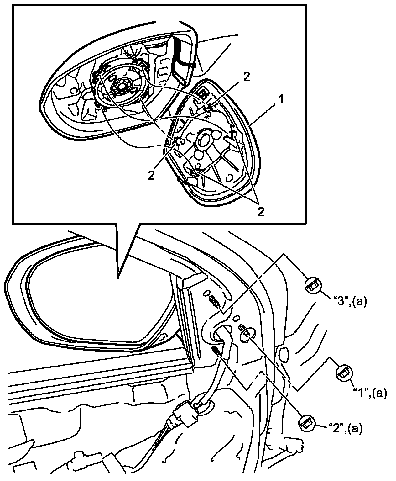 - Tighten door mirror nuts in order ("1" to "3") to specified torque.