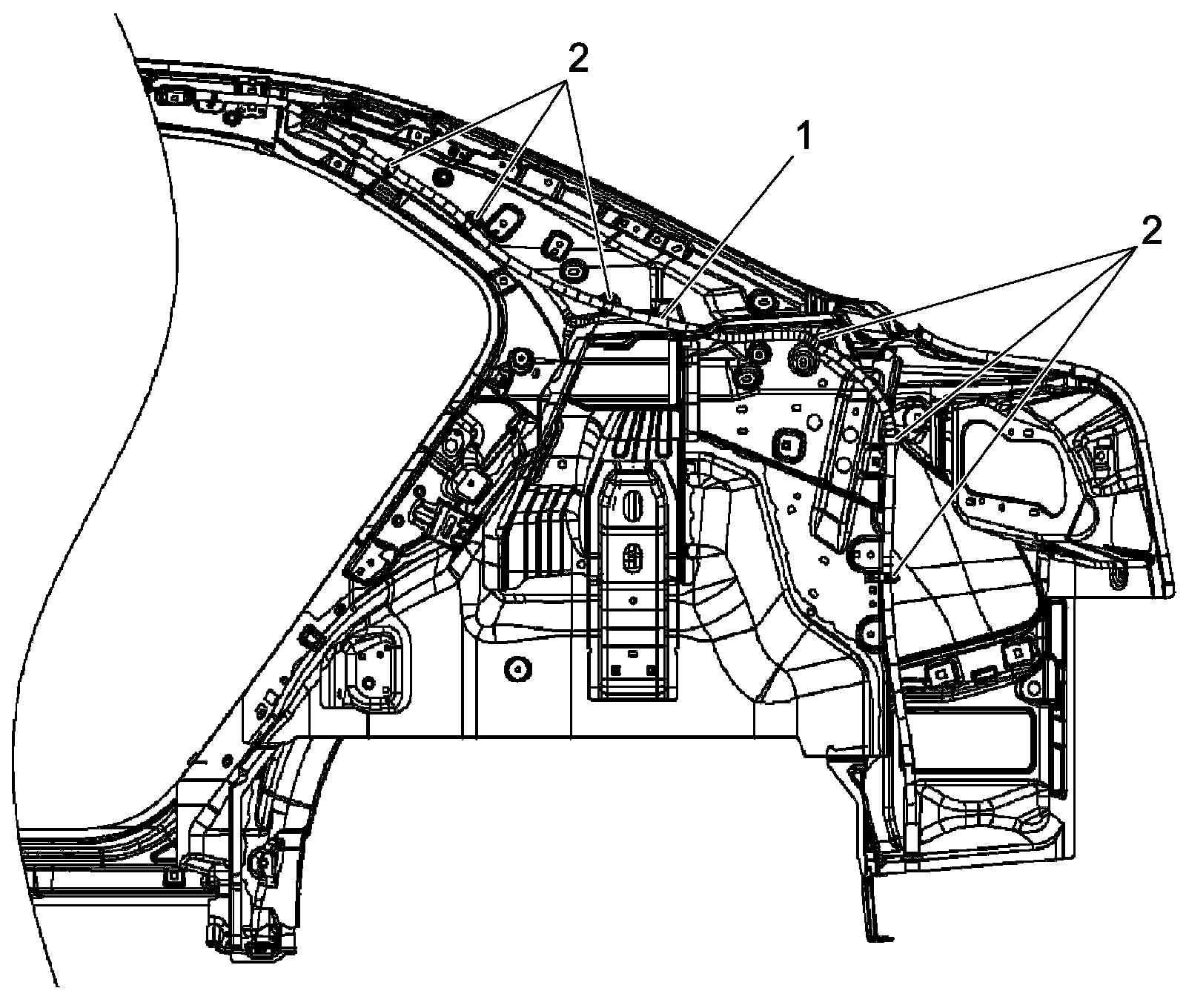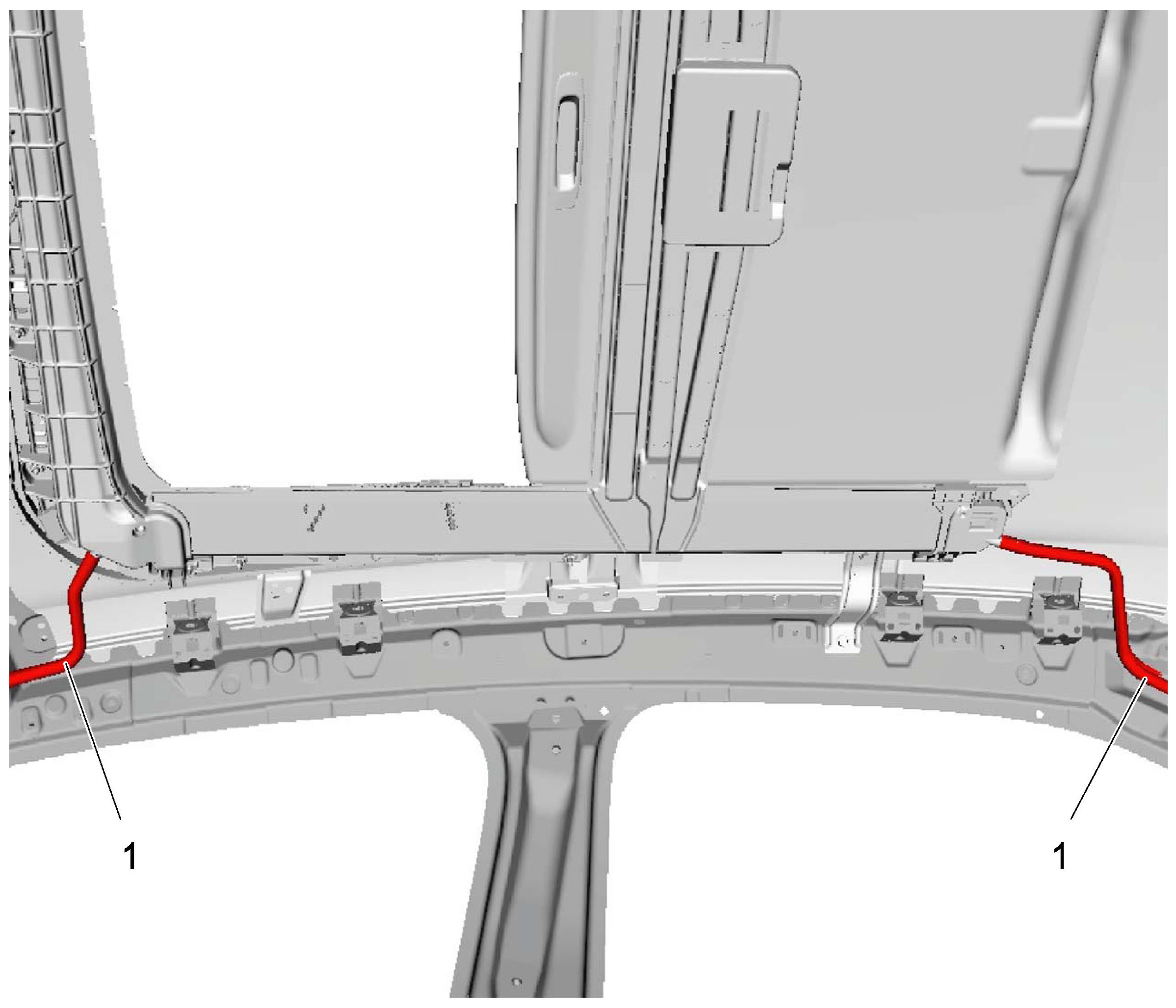 - Connect drain hoses (1) to sun roof assembly at 4 locations. Clamp drain hoses by clamps (2) securely.