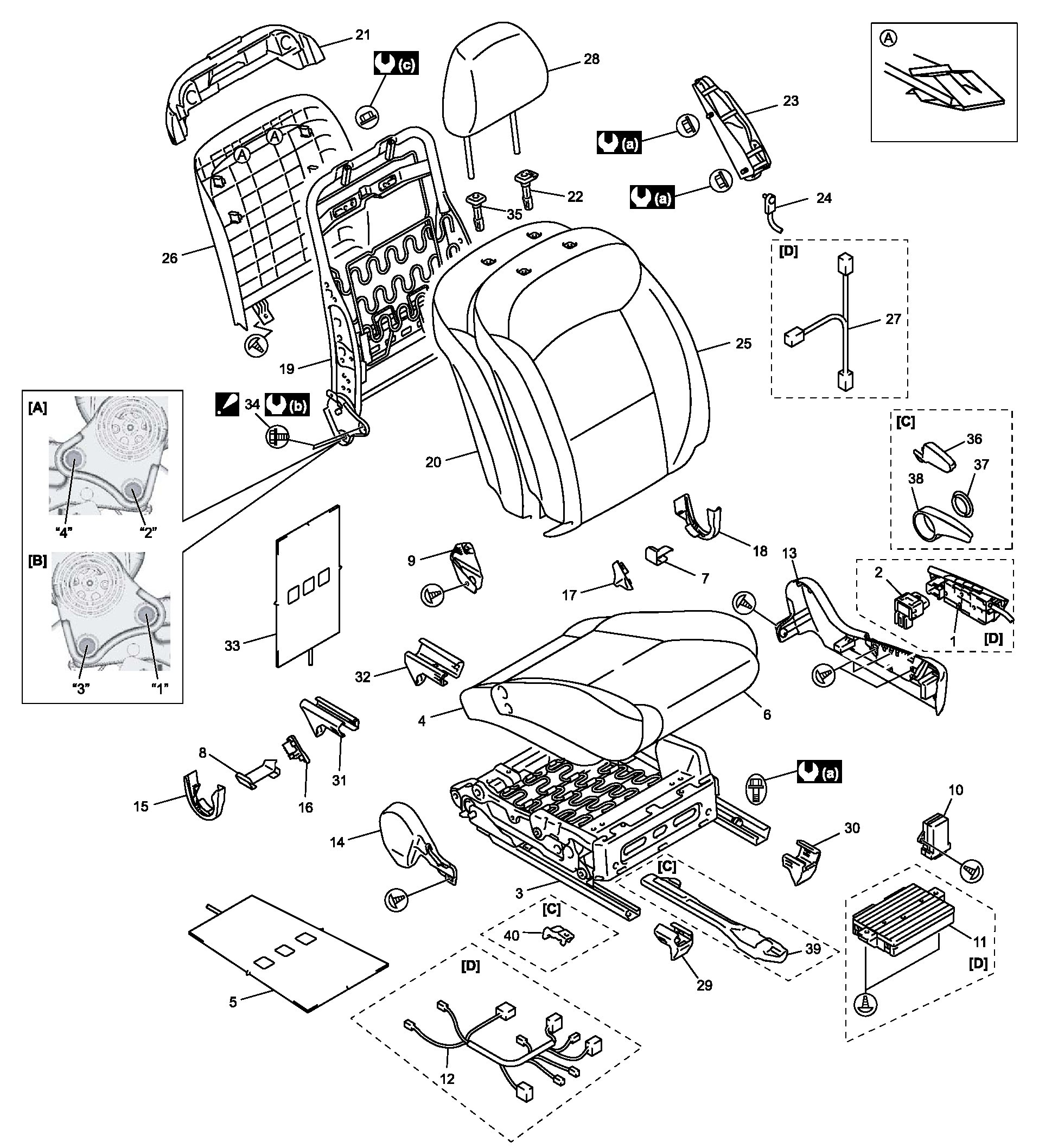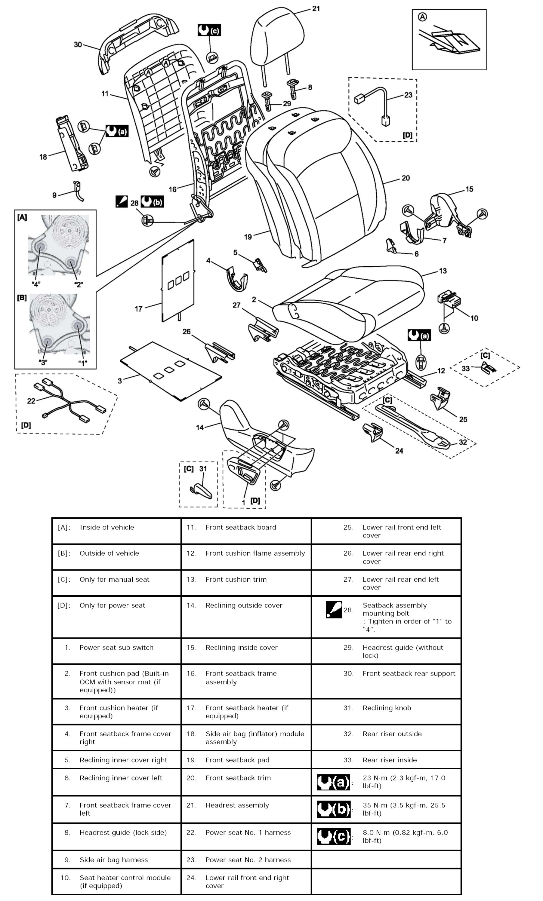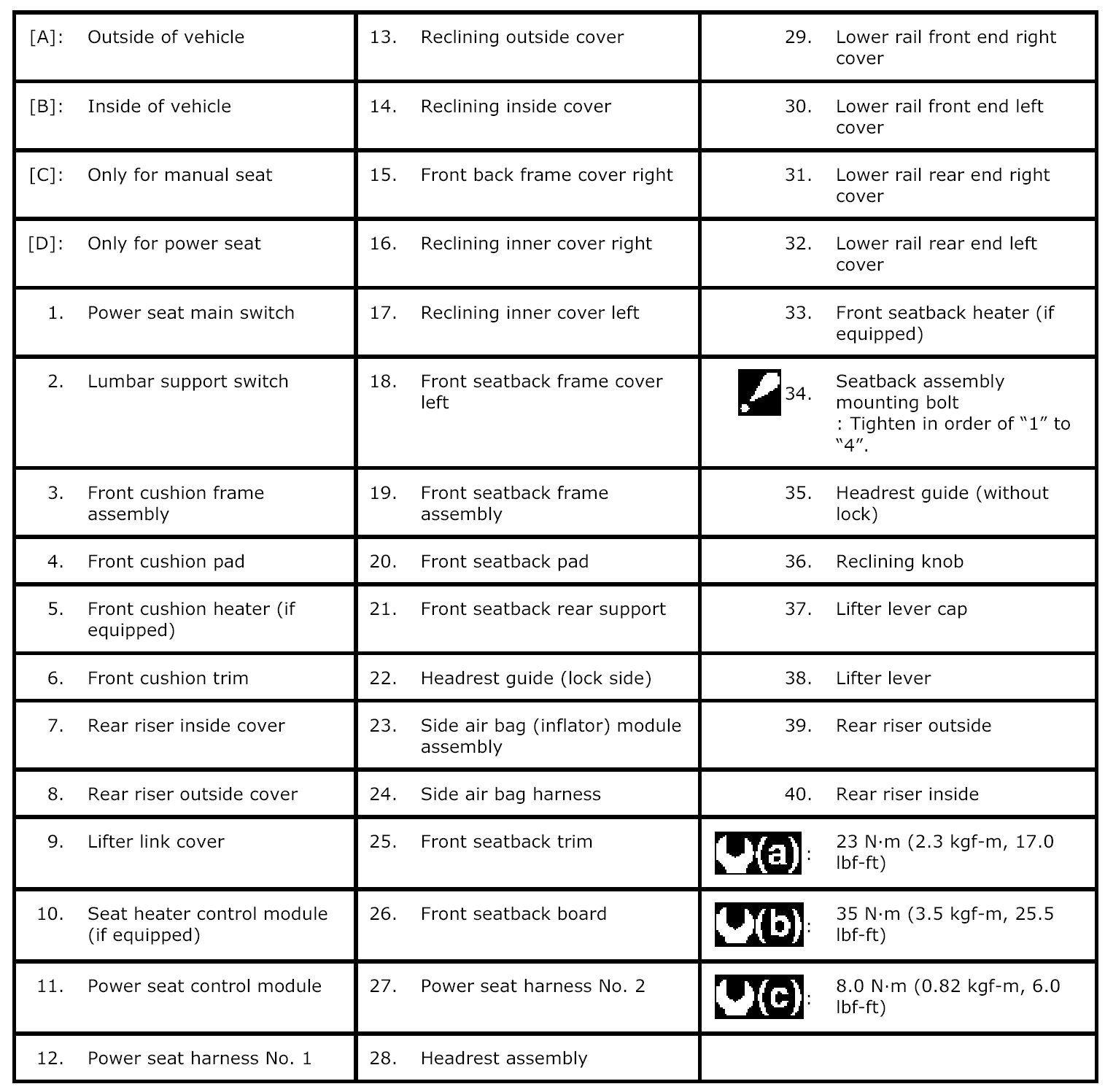Front Seat ComponentsThis figure shows example of power seat components and specific components to manual seat. Although figure does not show manual seat components of identical names with power seat counterparts, there are differences in shape and design between them. When replacing any seat component, be sure to select correct one referring to parts catalog.