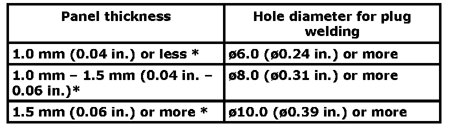 - Select hole diameter for plug welding referring to following table according to panel thickness and type of steel panel.