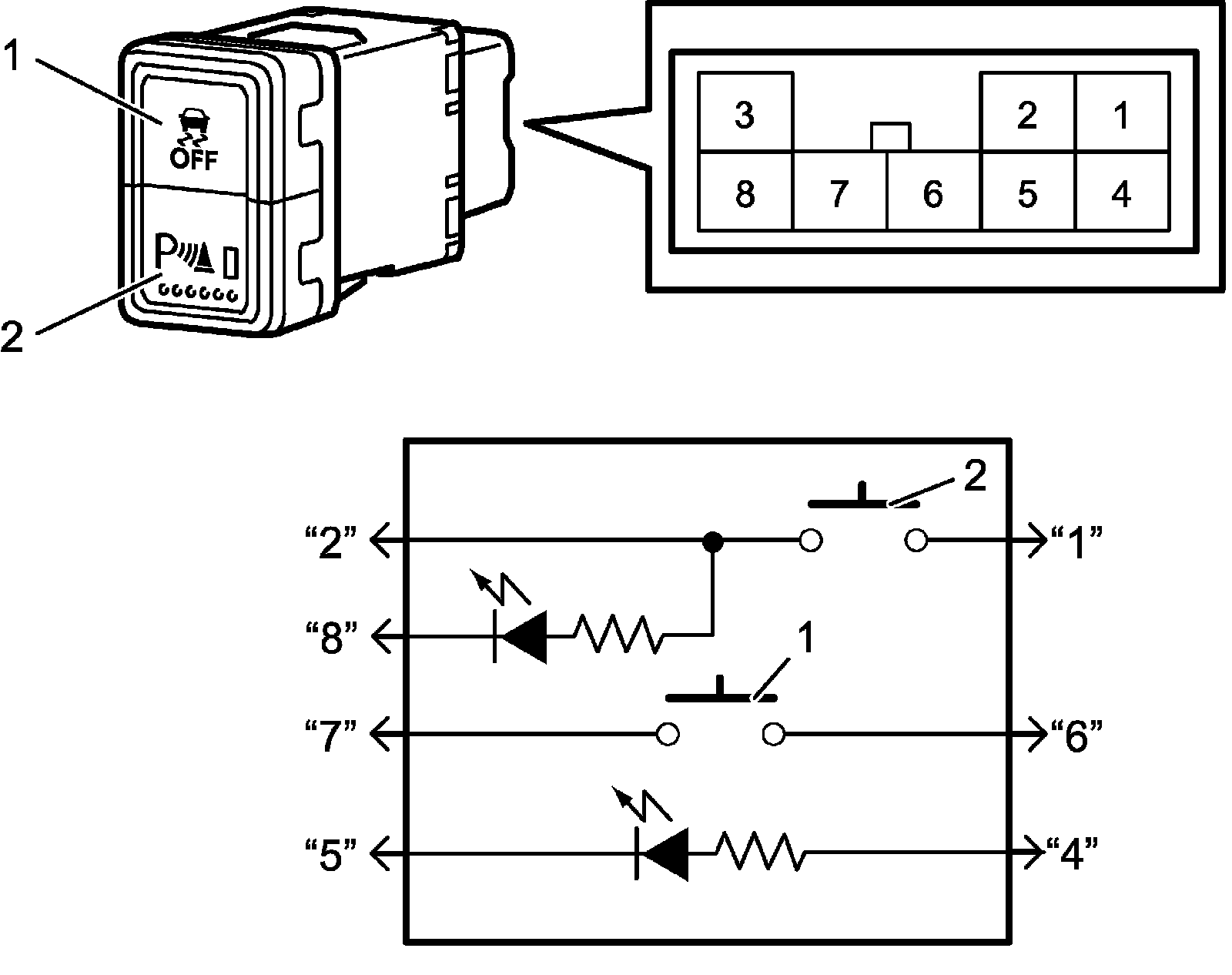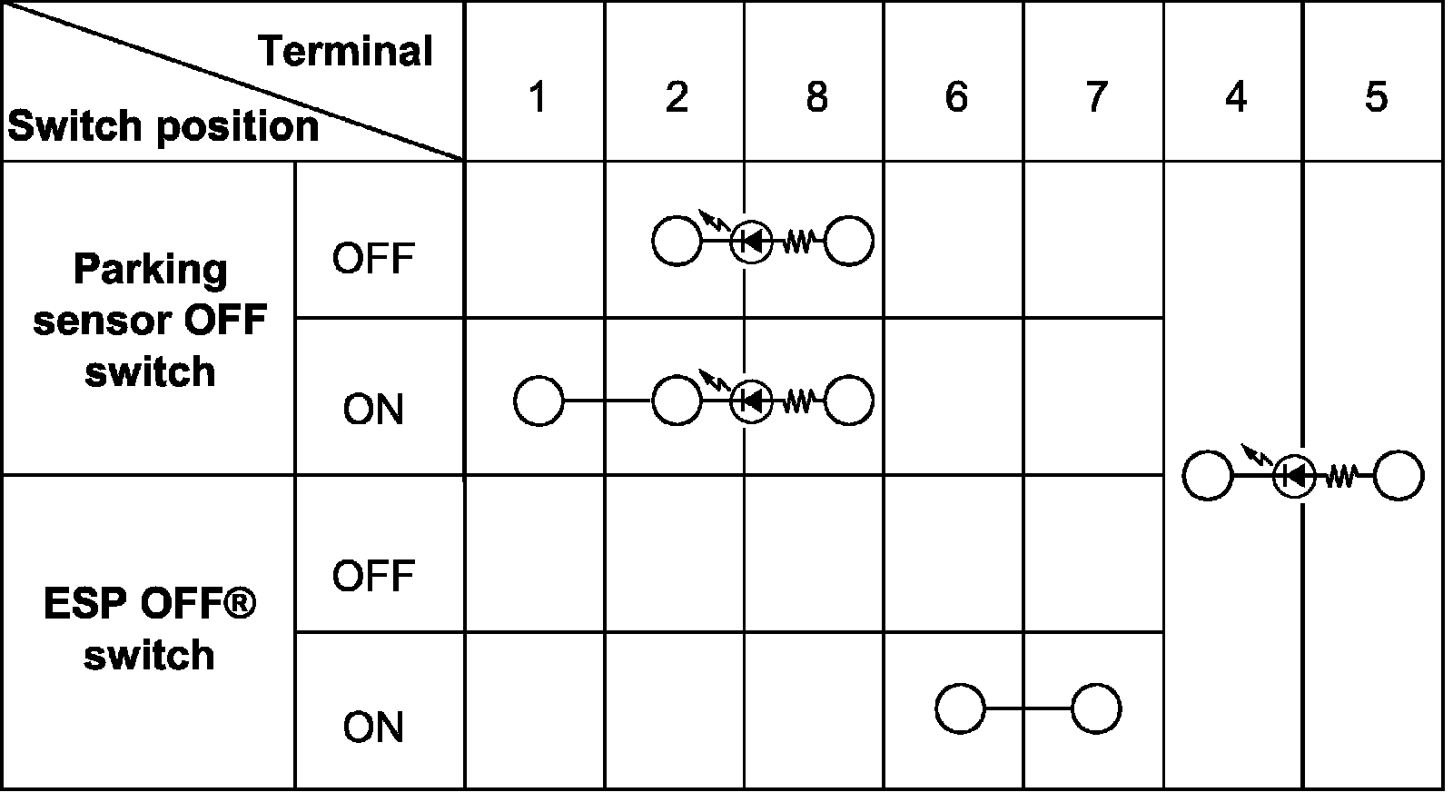 Check ESP(R) OFF & parking sensor OFF switch for continuity between terminals at each switch position.