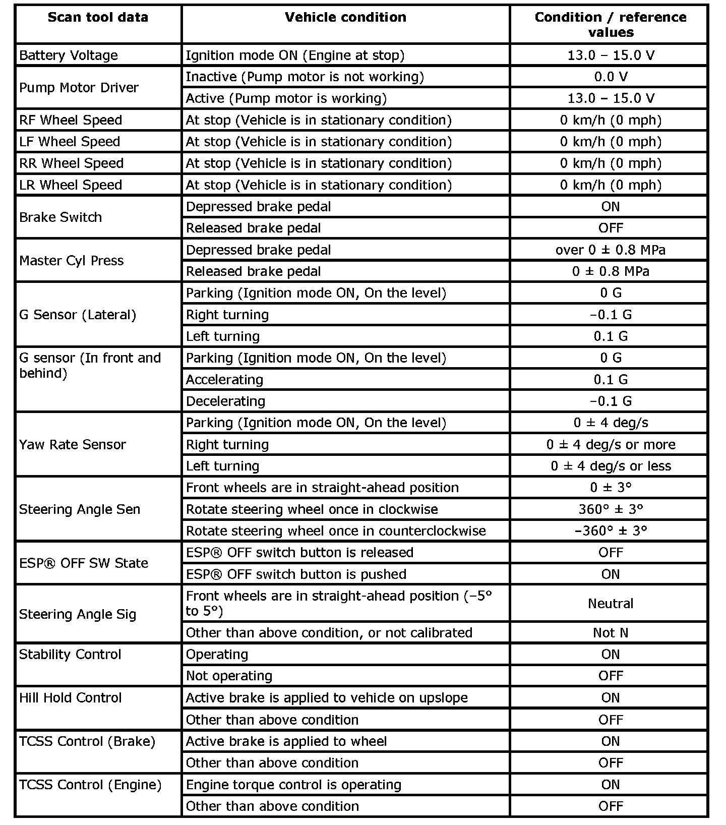 RF Wheel Speed, LF Wheel Speed, RR Wheel Speed and LR Wheel Speed (km/h, MPH) Wheel speed is ESP(R) control module internal parameter. It is computed by reference pulses from the wheel speed sensor.
