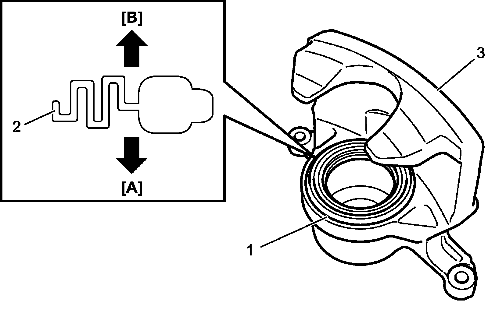 c) Apply rubber grease to new cylinder boot (1). And then place lip (2) of cylinder boot onto caliper cylinder (3) of front brake caliper as shown.