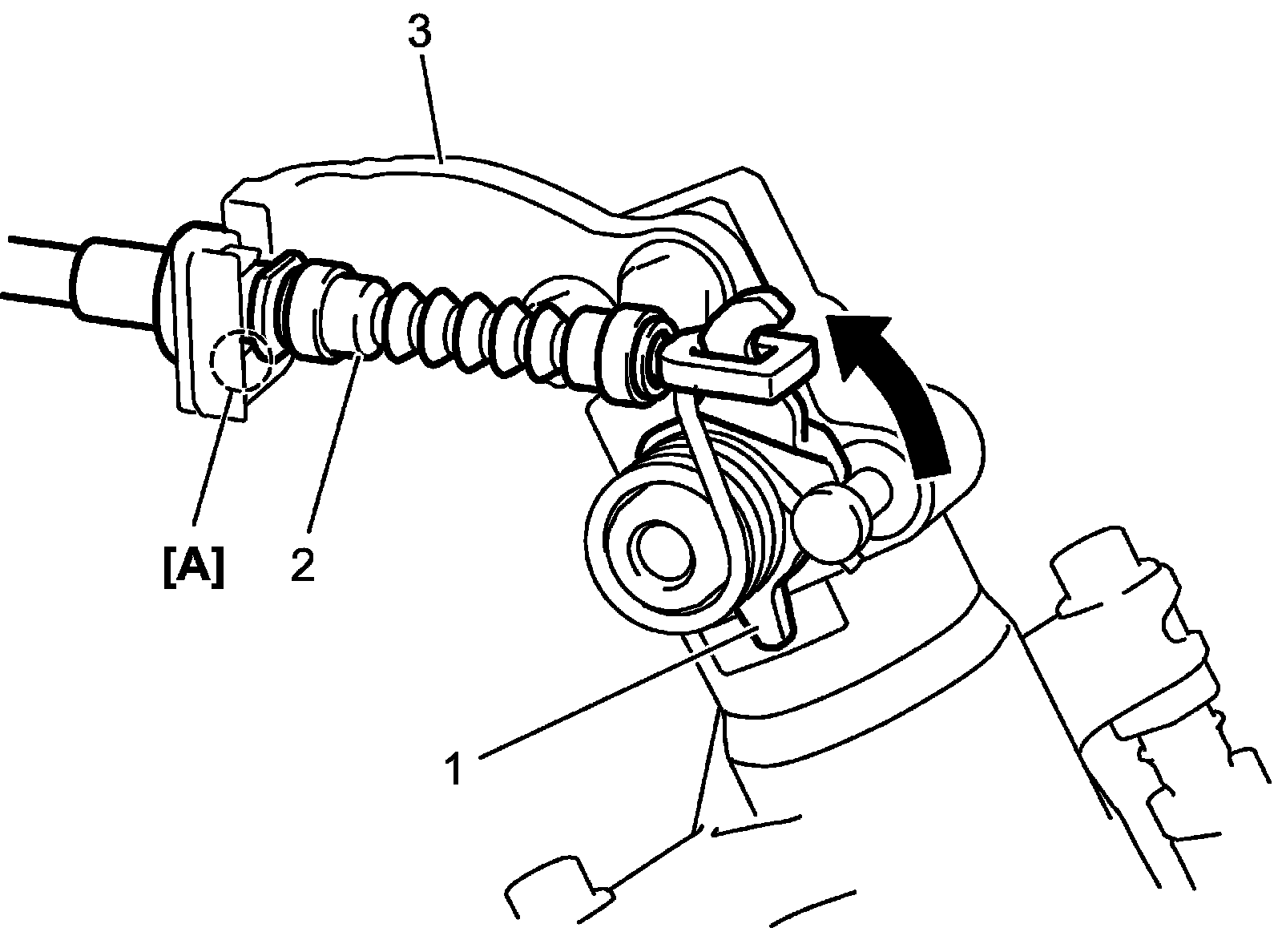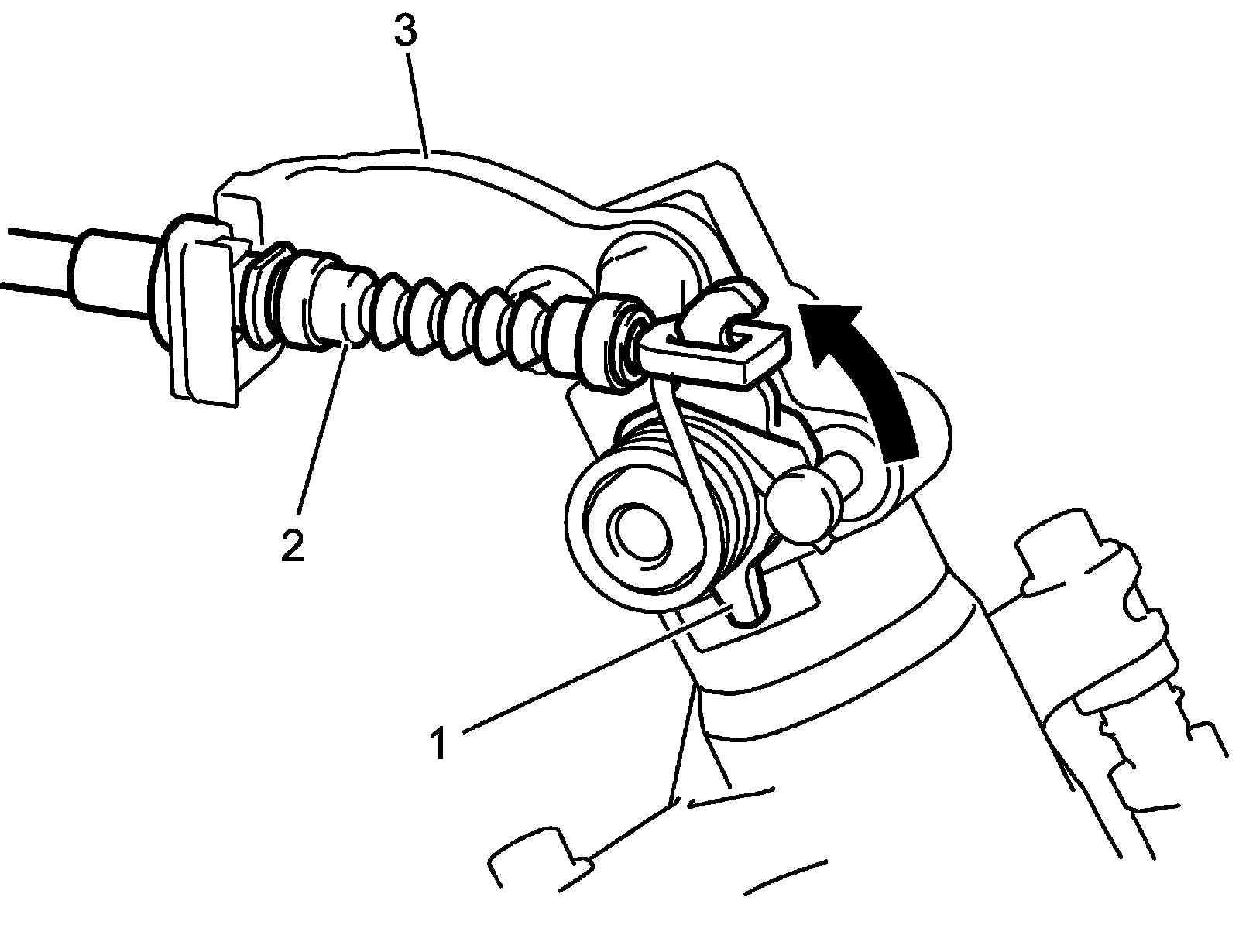 6) Turn lever (1) in arrow direction and remove parking brake cable (2) from lever and bracket (3).