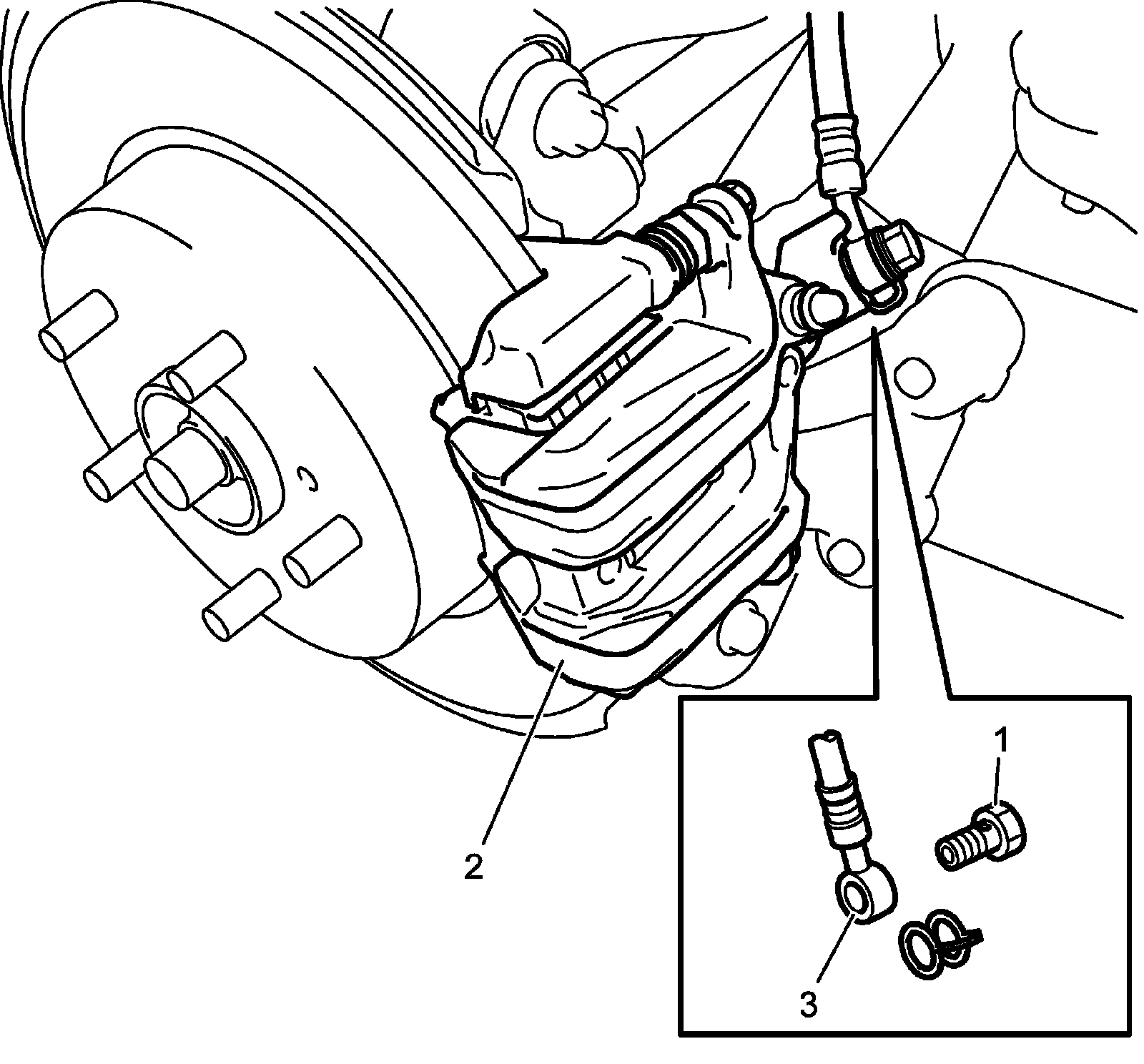 7) Place a container to catch brake fluid from disconnected rear brake flexible hose (3) below rear brake caliper (2).