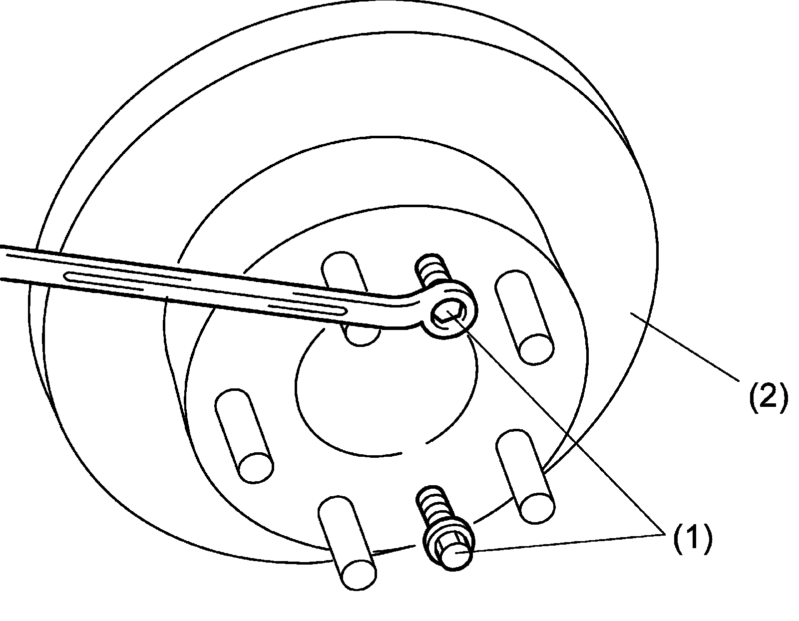 4) Push out rear brake disc (2) by tightening two M8 bolts (1) evenly into jack bolt holes.