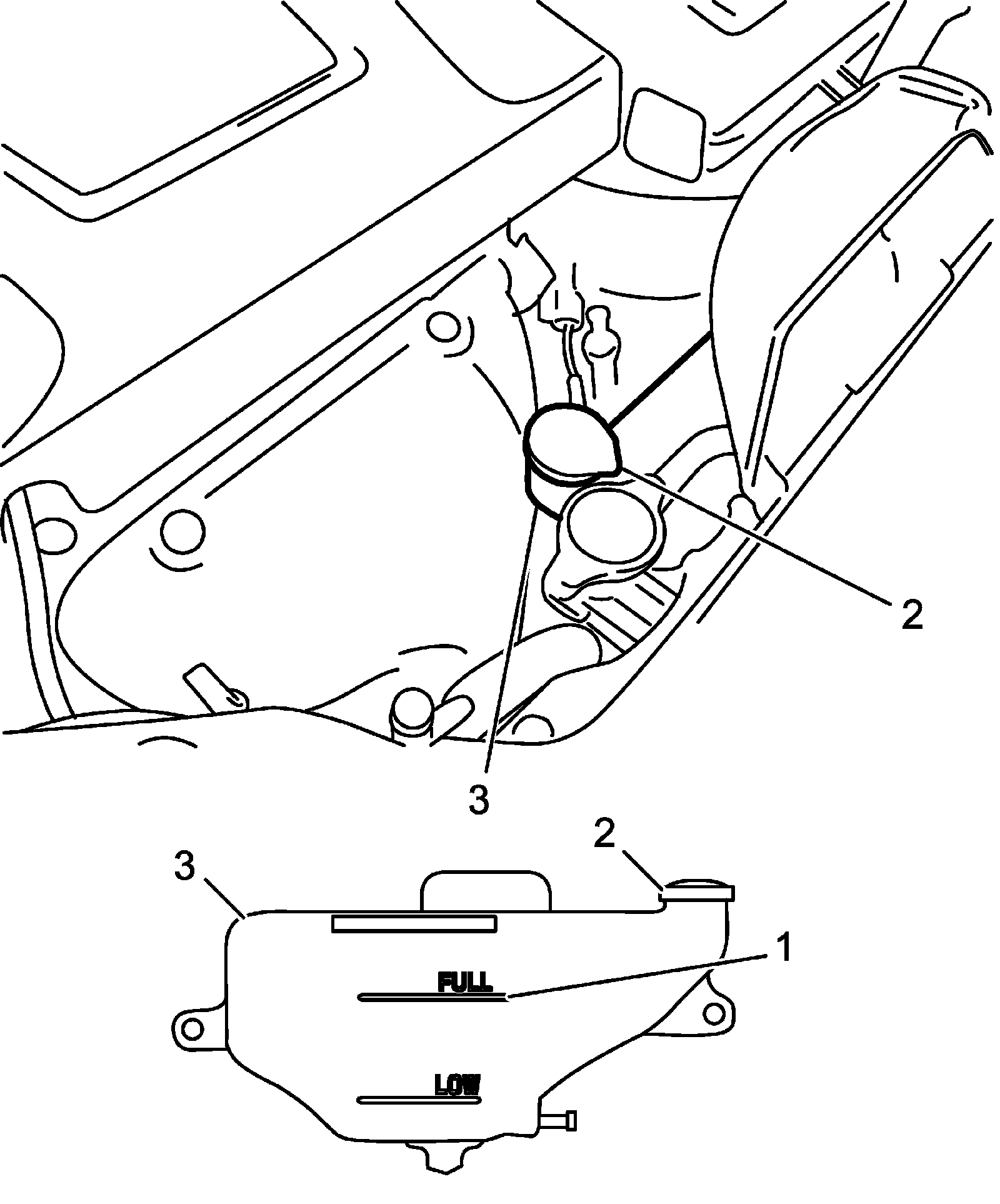 1) Fill reservoir (3) with coolant up to "FULL" level mark (1).