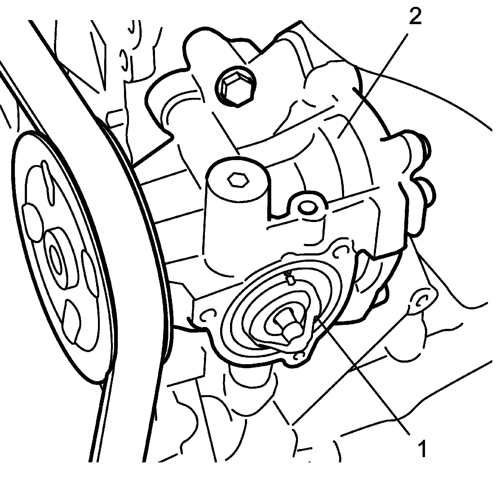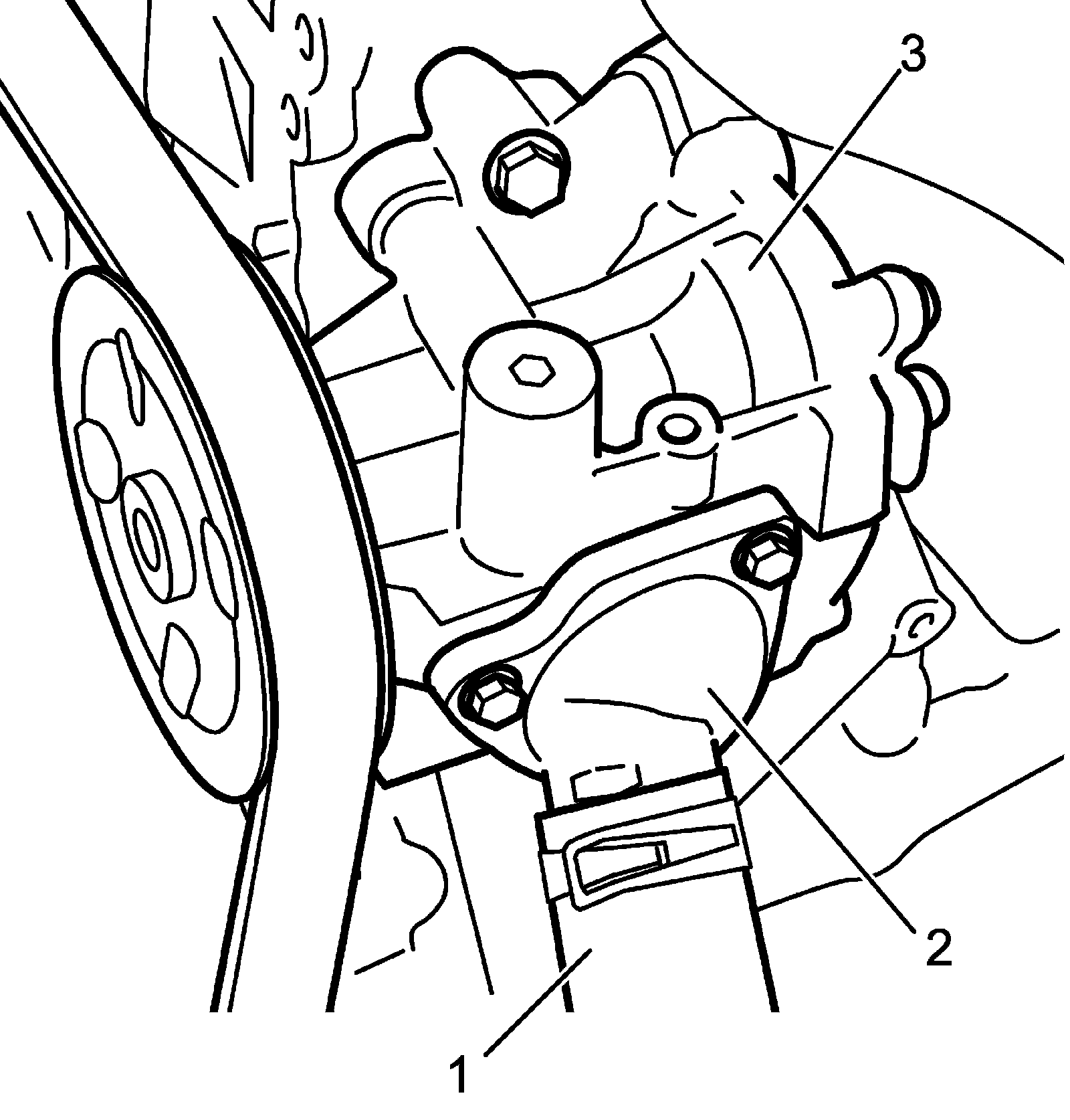 3) Disconnect radiator outlet hose (1) from thermostat cap (2).