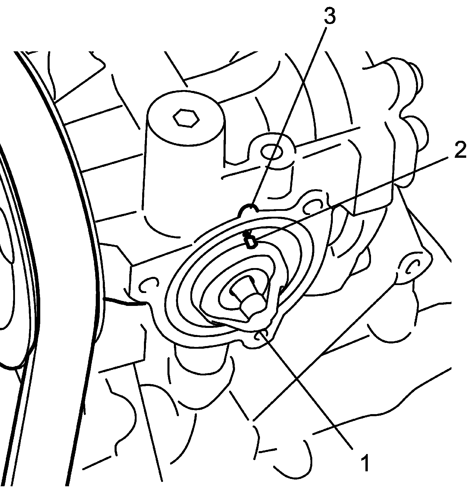 ^ When installing thermostat (1) on water pump case, be sure to position it so that air bleed valve (2) is aligned with matchmark (3).