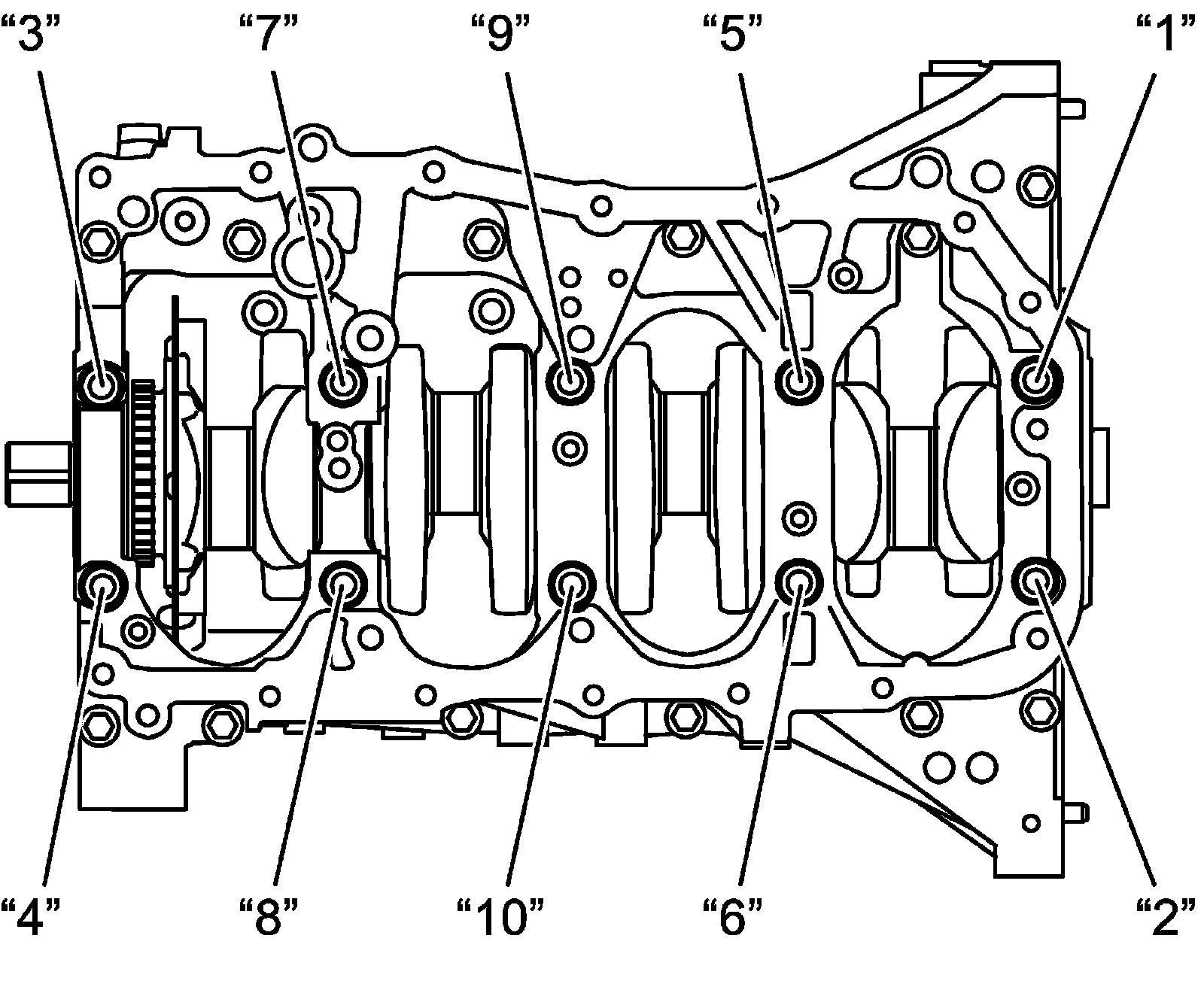 10) Loosen crankcase bolt No.1s in numerical order ("1" - "10") evenly and gradually, and then remove lower crankcase and rear oil seal.