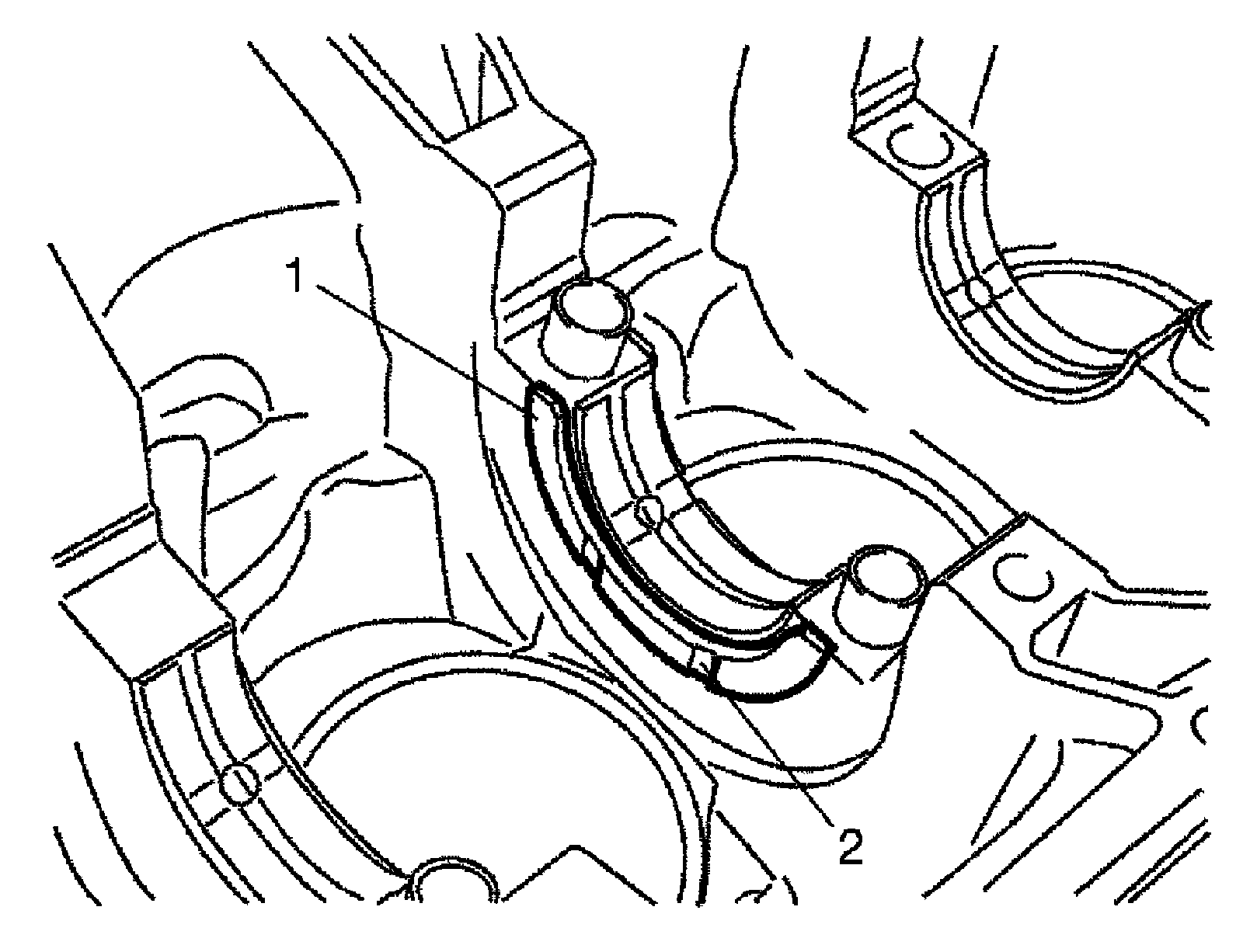a) Fit the tab (1) on each bearing into recess (2) in cylinder block or lower crankcase.