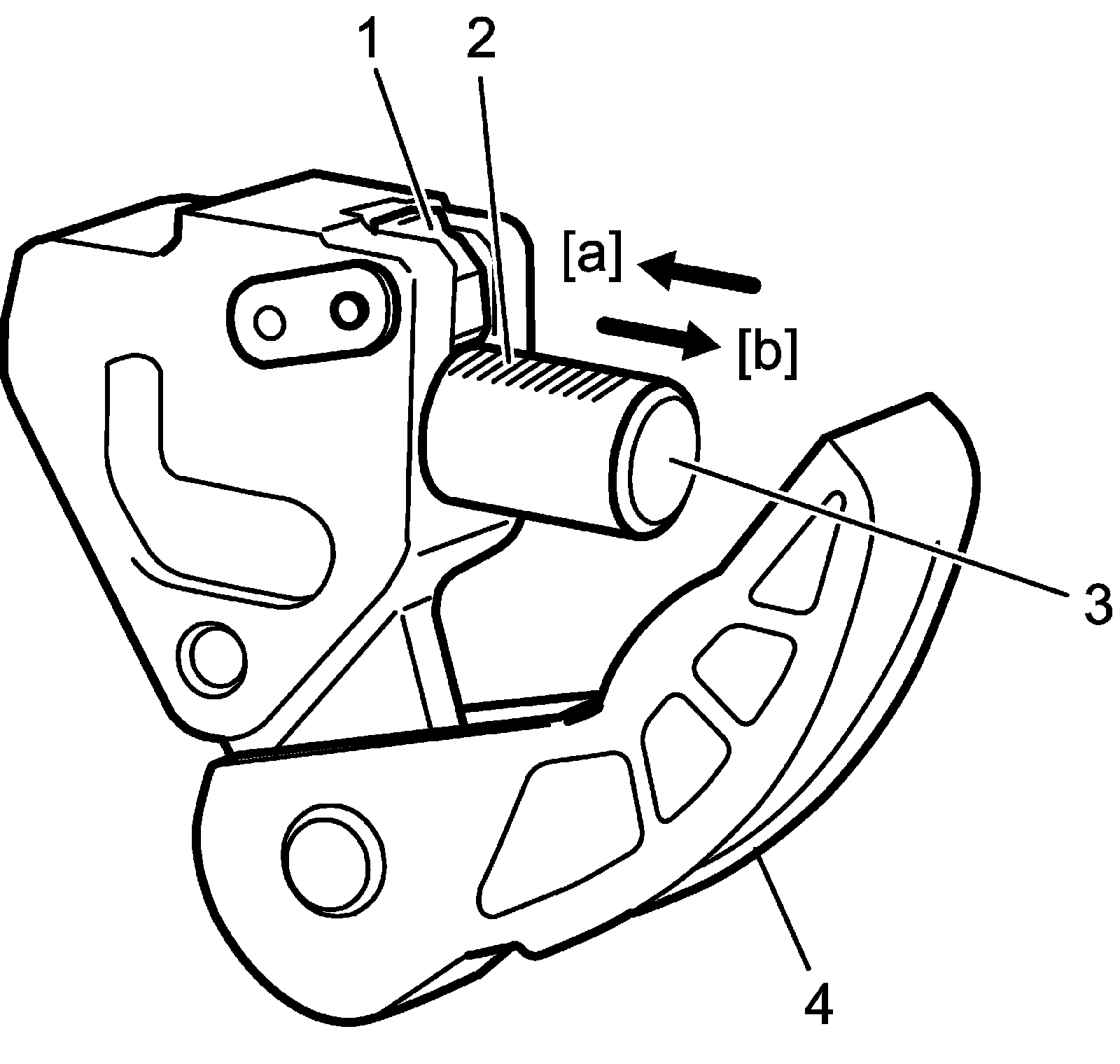 ^ Check that plunger (3) moves in direction [b] and does not move in direction [a] when latch (1) engages with plunger teeth (2).