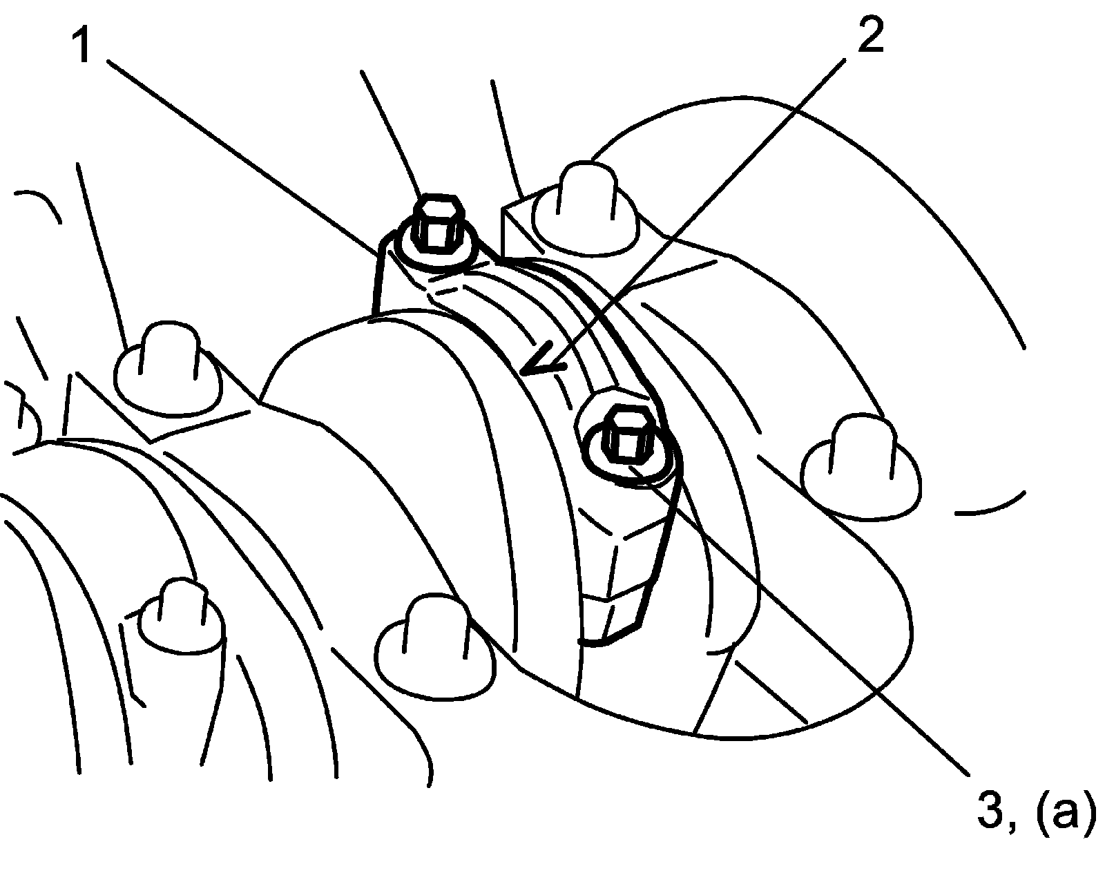 a) Direct arrow mark (2) on connecting rod bearing cap (1) to crankshaft pulley side.