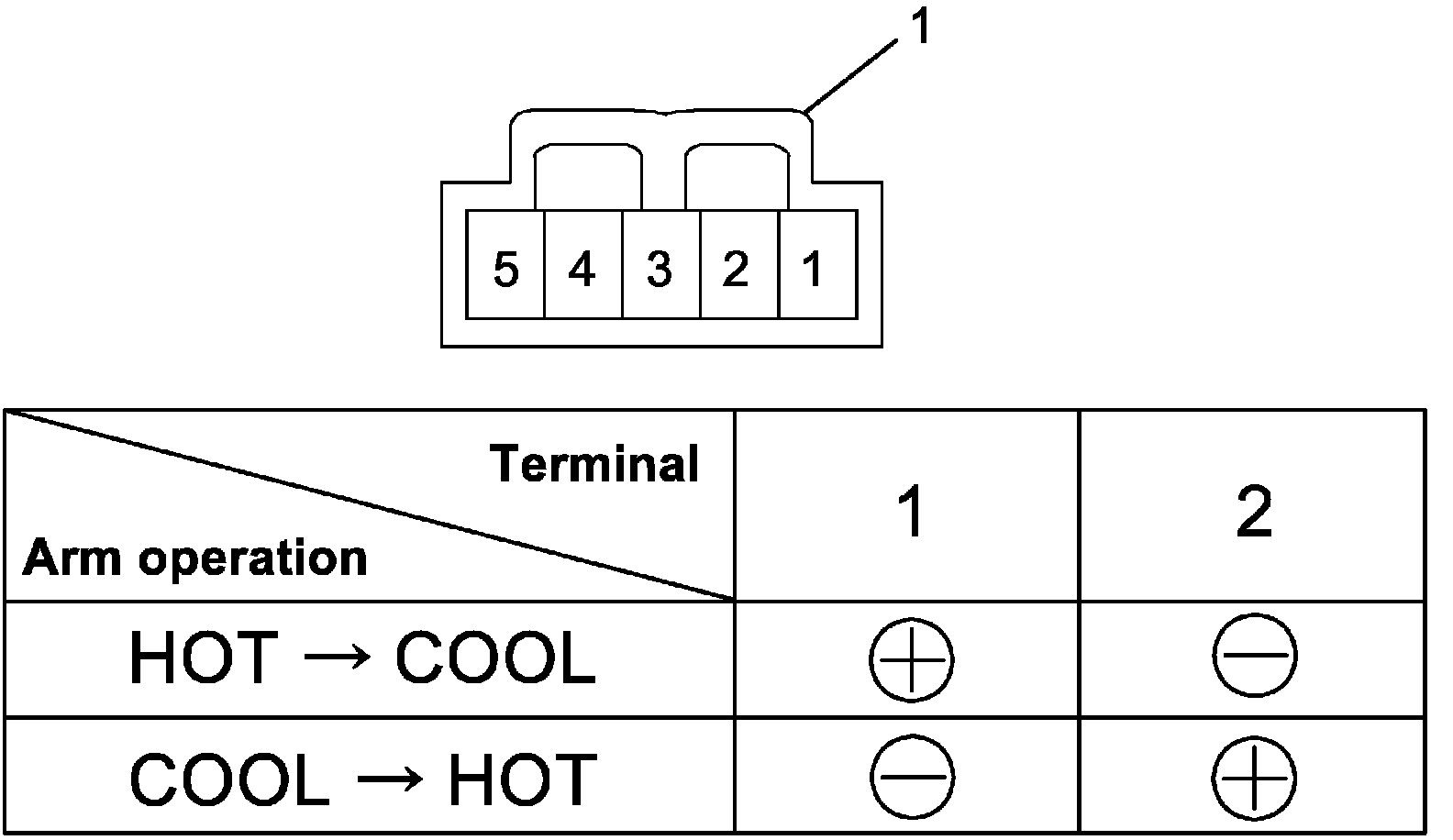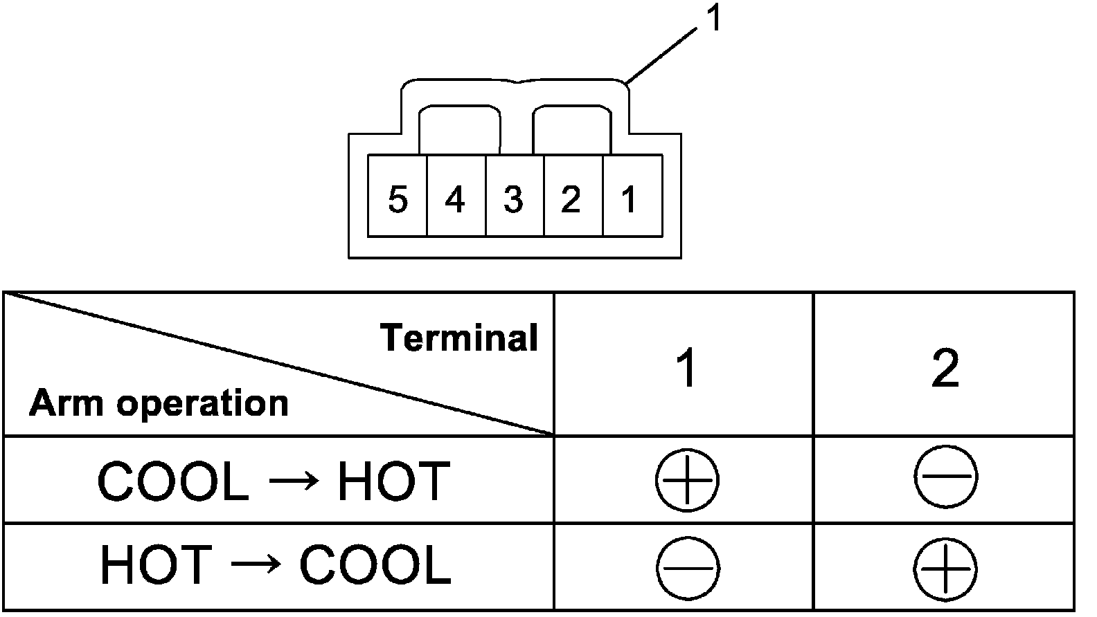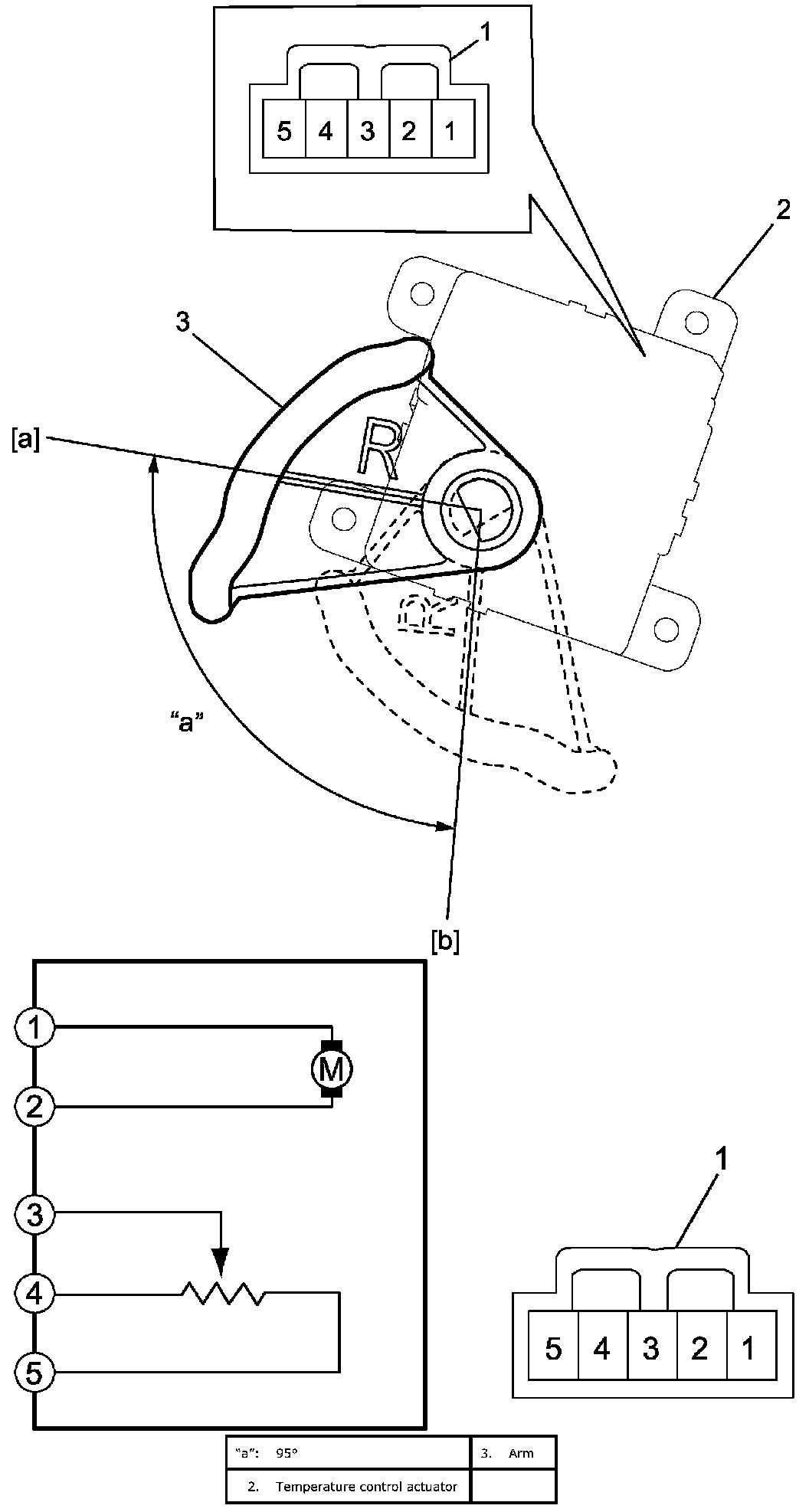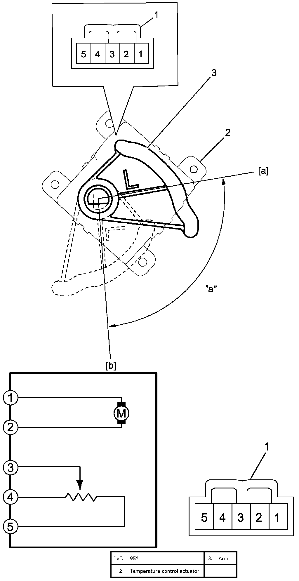 Temperature Control Actuator Inspection1. Set arm to actuator and check if arm operates smoothly when battery voltage is conducted to terminals of actuator connector (1).