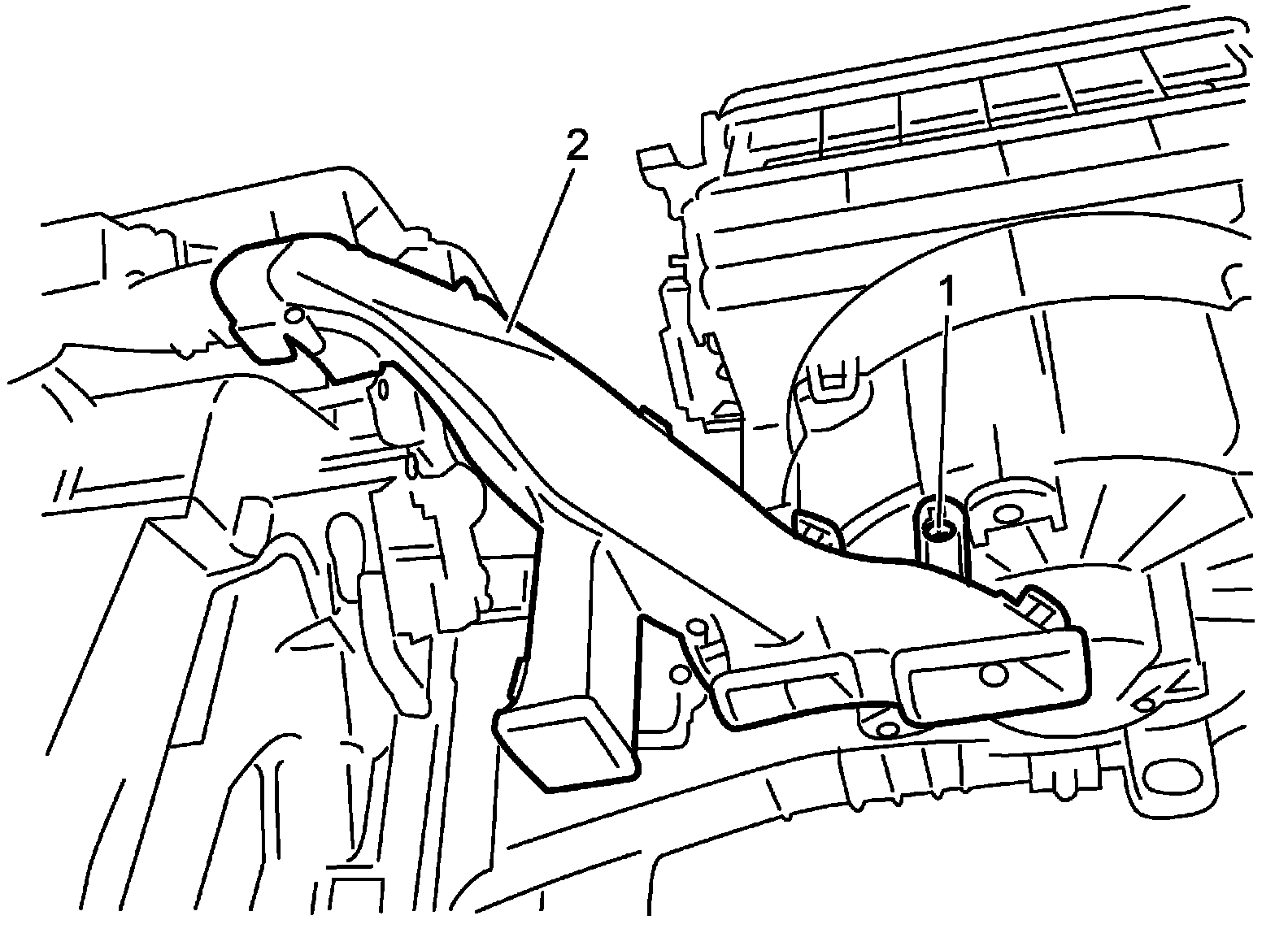2. Remove screw (1), and then remove passenger side foot duct (2) from HVAC unit.