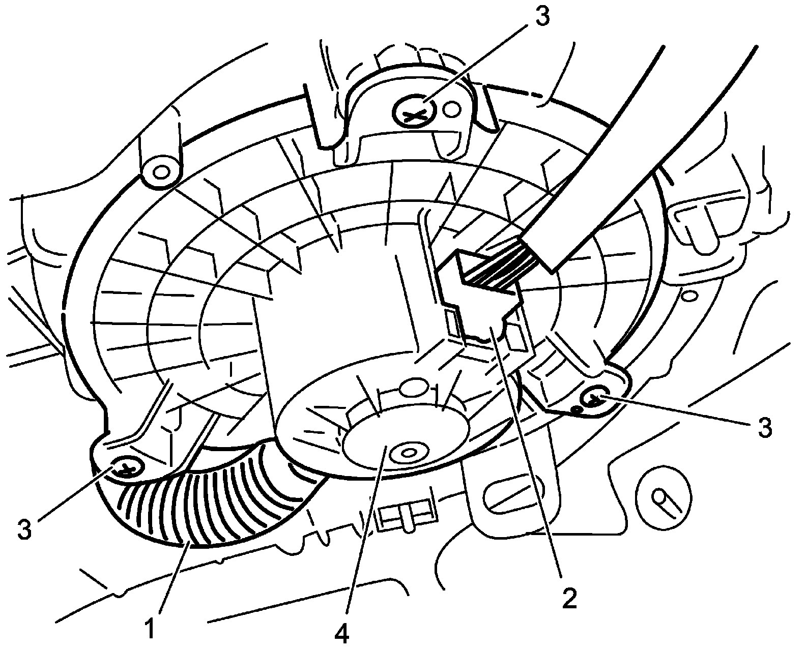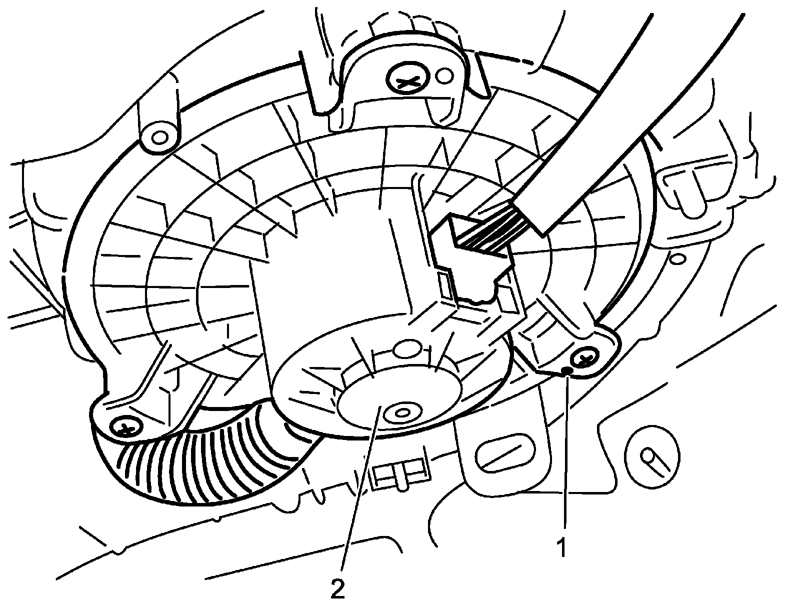 - Make sure protrusion (1) on HVAC unit fits into the installation hole of blower motor (2).