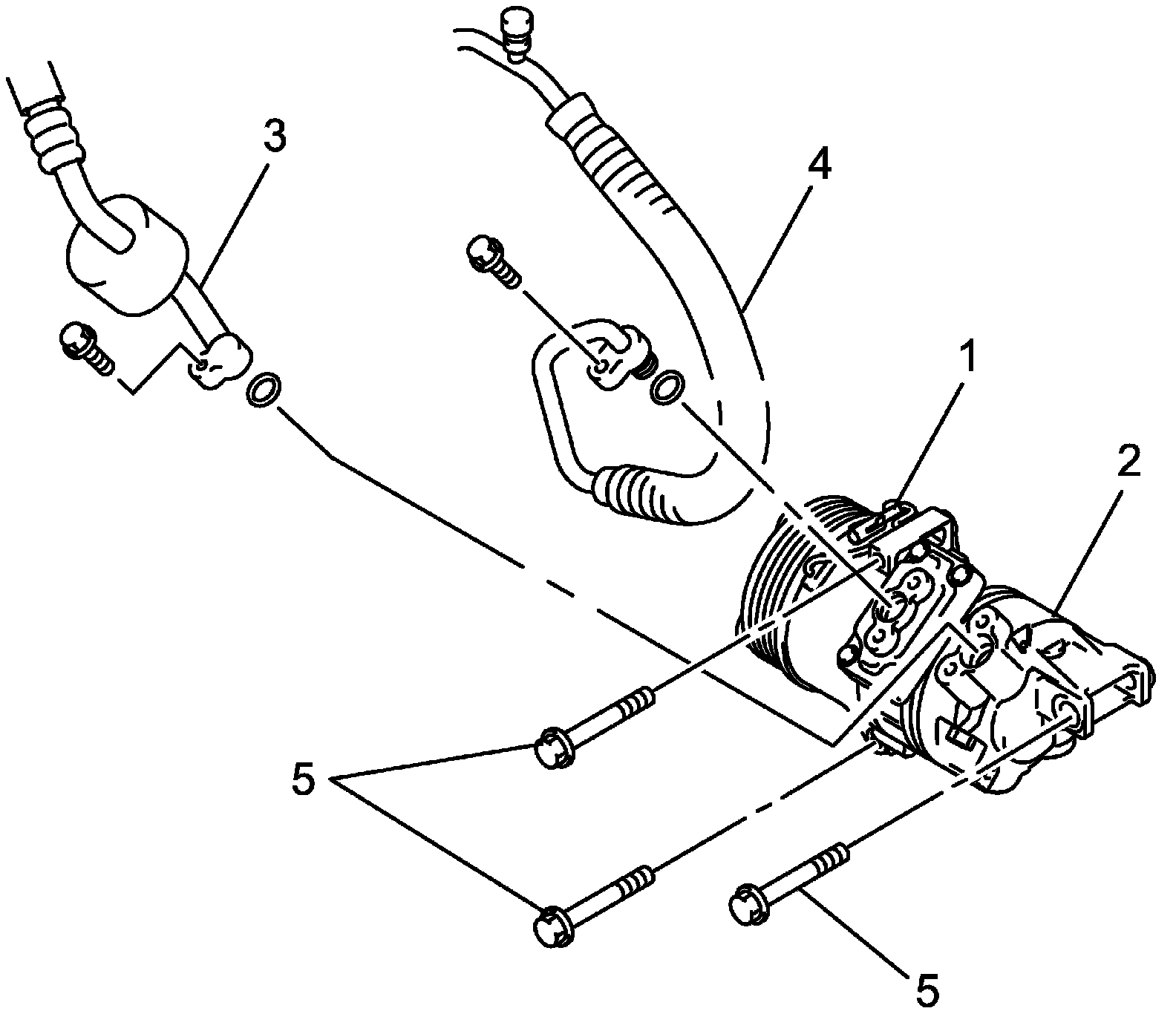 6. Disconnect suction hose (3) and discharge hose (4) from A/C compressor (2).