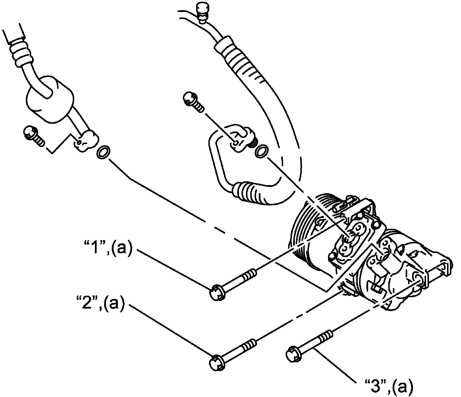 - Tighten A/C compressor mounting bolts in numerical order ("1" through "3") to specified torque as shown.