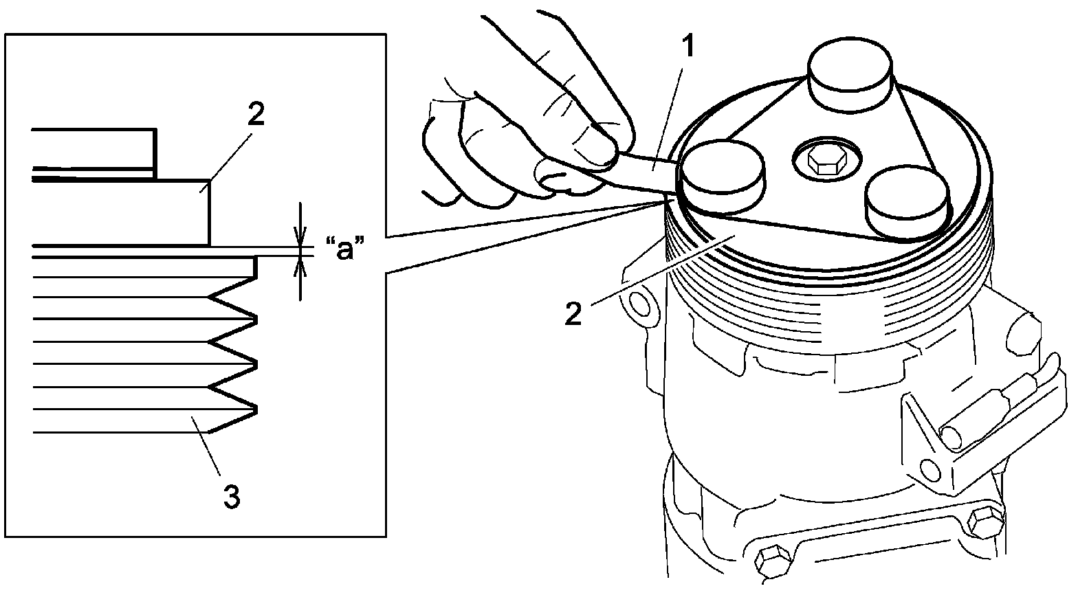 - Check clearance "a" between armature plate (2) and magnet clutch pulley (3) using feeler gauge (1).