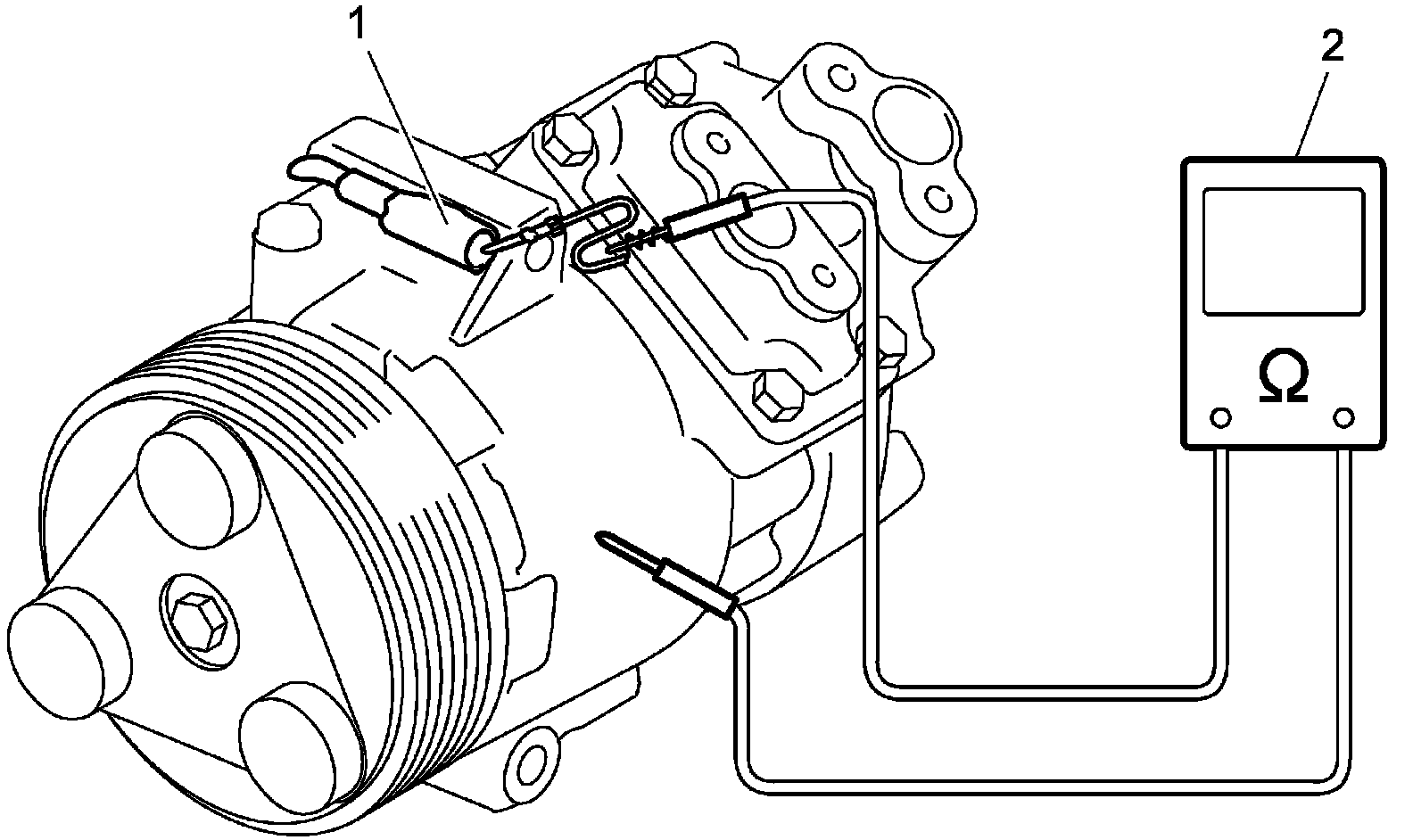 Using ohmmeter (2), measure resistance of starter coil between clutch lead wire (1) and A/C compressor body.