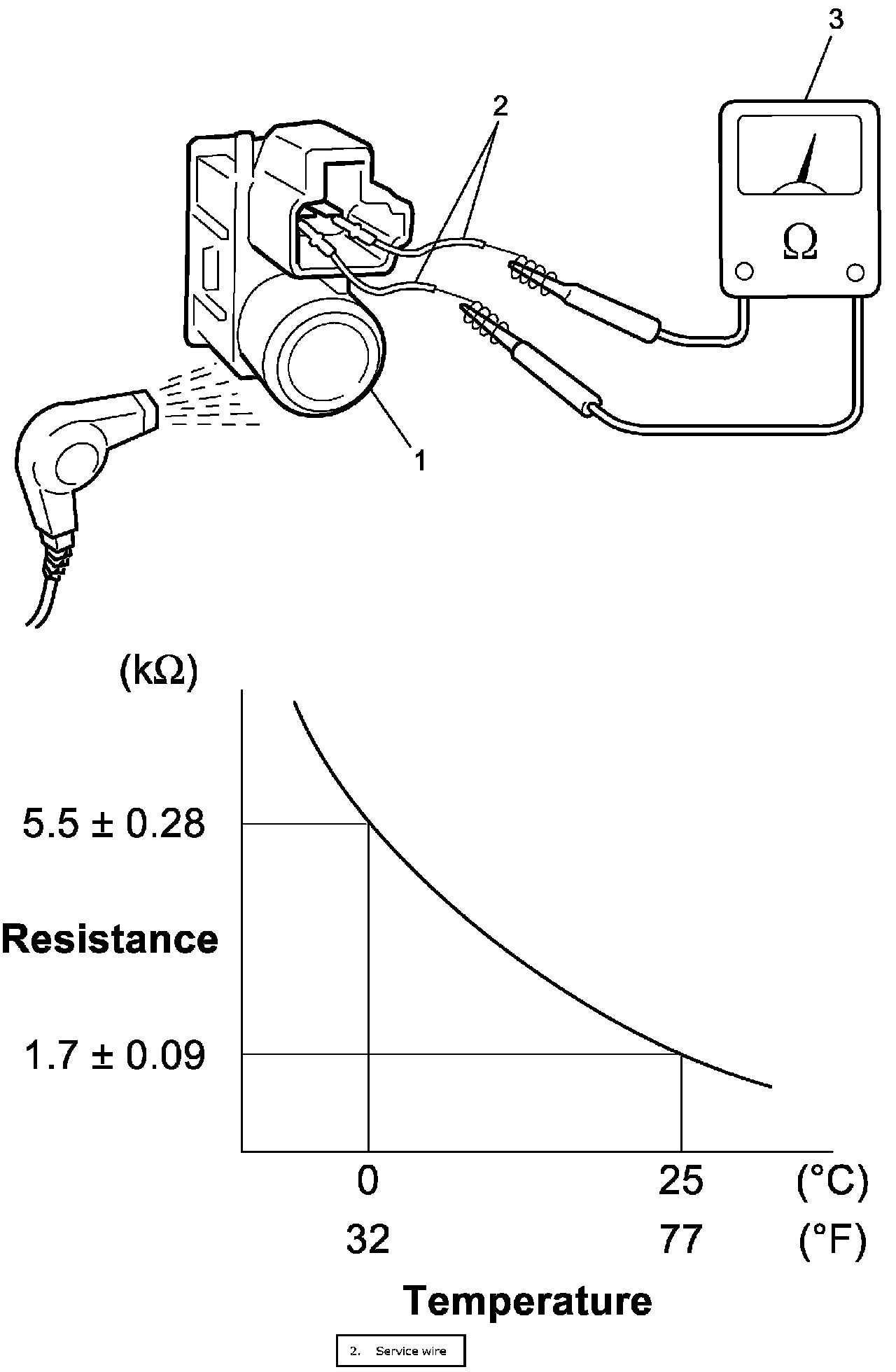 Inside Air Temperature Sensor Inspection1. Blow hot air to inside air temperature sensor (1), and measure resistance by using ohmmeter (3).
