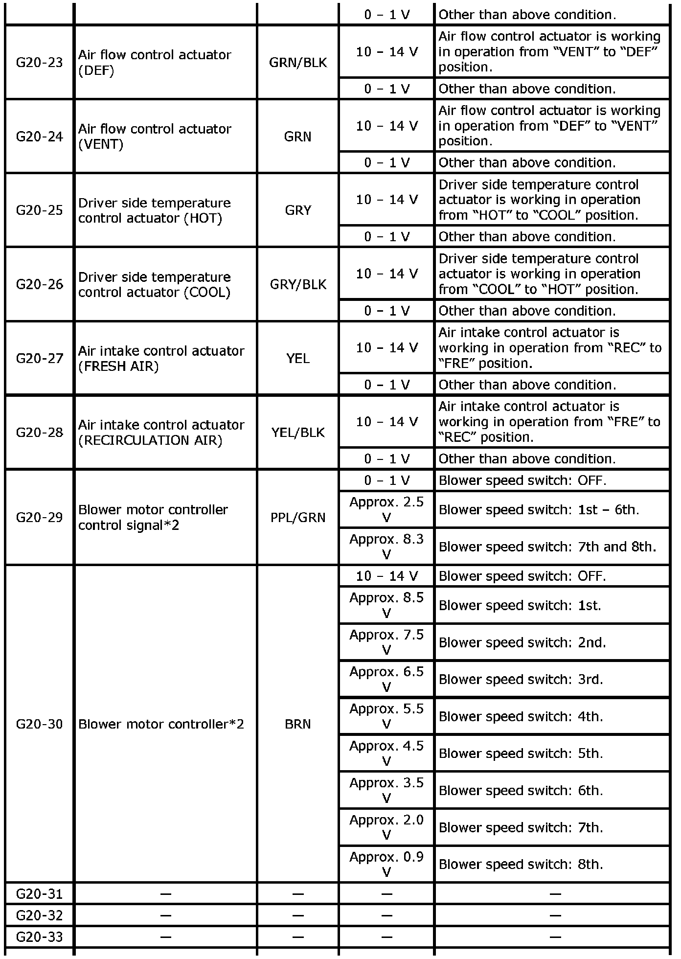 - Normal voltage of circuits with asterisk (*2) are reference values corresponding to when control puts the temperature control actuator at max cool position, air flow control actuator at "VENT" position, air intake control actuator at "REC" position and battery voltage is approx. 12 V.